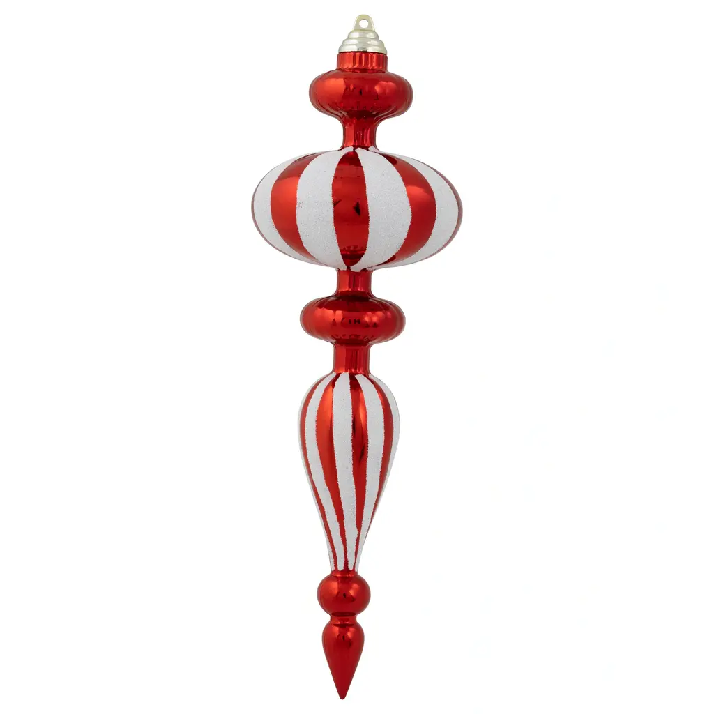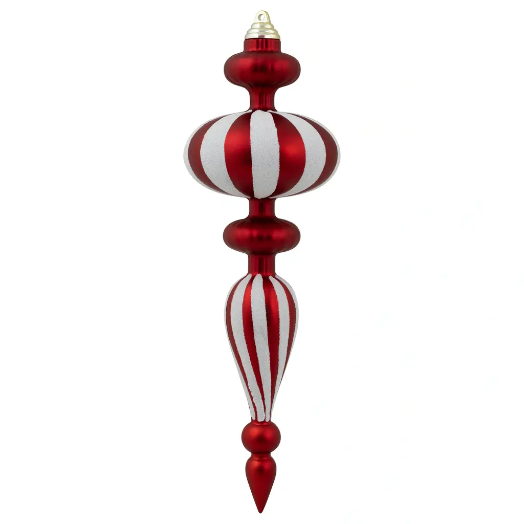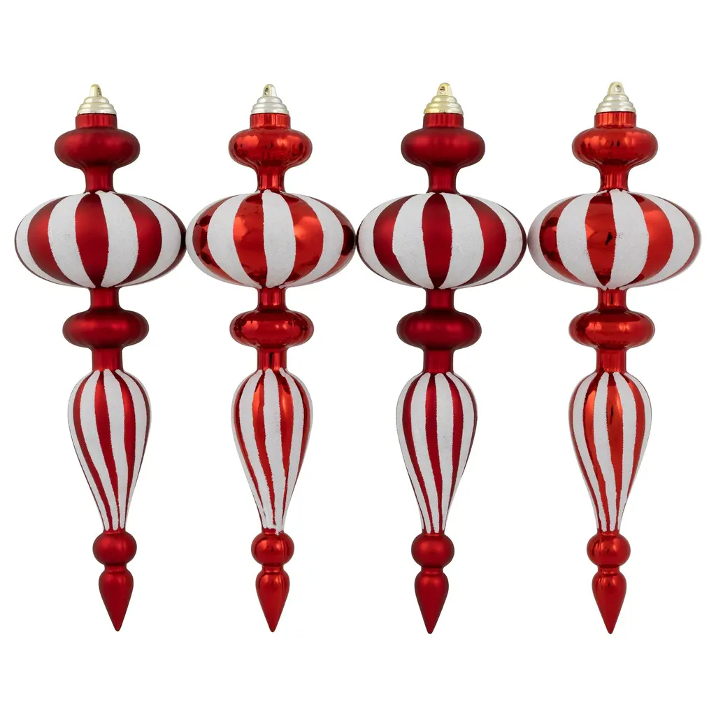 Add a dash of festive flair to your holiday decor with our commercial-sized shatterproof finial Christmas ornaments. These stunning ornaments feature a classic red and white color scheme, adorned with dazzling white glittered stripes for an extra touch of elegance. Each set includes two ornaments with a smooth matte finish and two with a shiny finish, allowing you to create the perfect balance of sophistication and shine on your Christmas tree. Crafted with durability in mind, these ornaments are shatterproof, ensuring they'll last for many seasons to come. Bring joy and cheer to your home or business this holiday season with these exquisite finial ornaments. Product Features: 4ct red and white Christmas finial ornaments White glittered stripe design Set includes 2 matte and 2 shiny ornaments Commercial size with a textured finish Large enough to decorate a large or commercial-size trees Can be used as a standalone Christmas hanging decoration Equipped with gold ornament caps and hanging cords For indoor use - if using outdoors place under a covered area Dimensions: 14" high x 4" diameter Material(s): plastic Note: Set includes 4 of the item shown; for a total of 4 ornaments