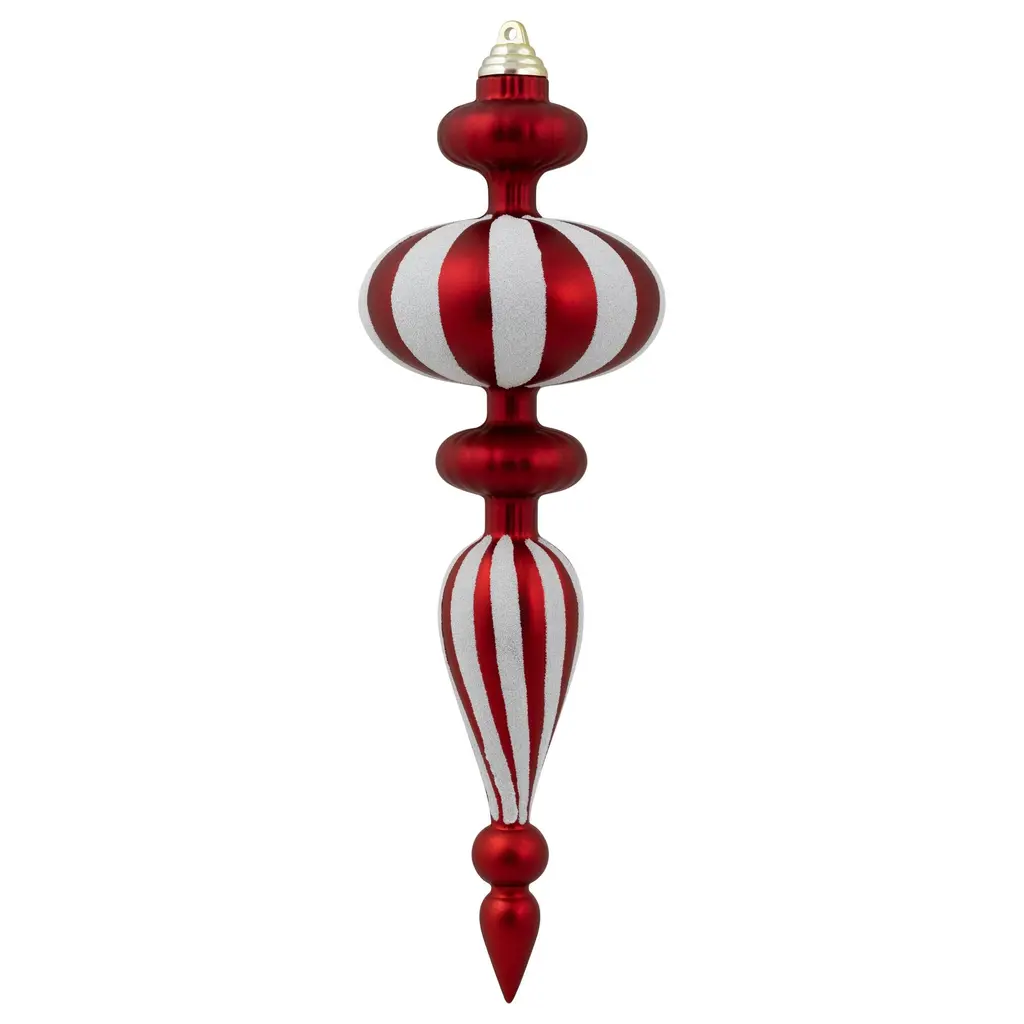 Add a dash of festive flair to your holiday decor with our commercial-sized shatterproof finial Christmas ornaments. These stunning ornaments feature a classic red and white color scheme adorned with dazzling white glittered stripes for an extra touch of elegance. Each set includes two ornaments with a smooth matte finish and two with a shiny finish allowing you to create the perfect balance of sophistication and shine on your Christmas tree. Crafted with durability in mind these ornaments are shatterproof ensuring they'll last for many seasons to come. Bring joy and cheer to your home or business this holiday season with these exquisite finial ornaments. Product Features: 4ct red and white Christmas finial ornaments White glittered stripe design Set includes 2 matte and 2 shiny ornaments Commercial size with a textured finish Large enough to decorate a large or commercial-size trees Can be used as a standalone Christmas hanging decoration Equipped with gold ornament caps and hanging cords For indoor use - if using outdoors place under a covered area Dimensions: 14" high x 4" diameter Material(s): plastic Note: Set includes 4 of the item shown; for a total of 4 ornaments