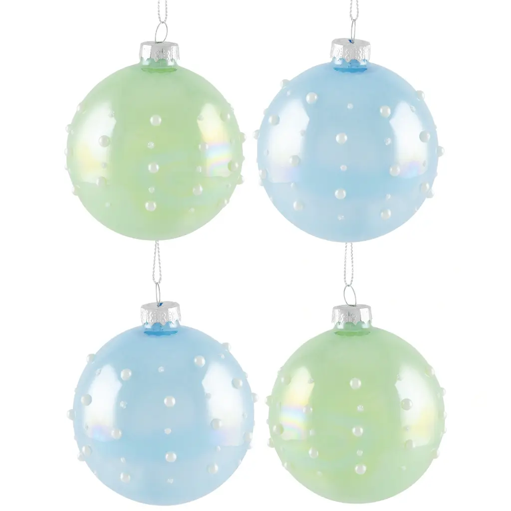 Add a touch of sparkle to your holiday decor with these glass ball Christmas ornaments. Gleaming in shades of blue and green with a hint of iridescence each ornament is adorned with delicate white pearl drop accents creating an enchanting display that captures the magic of the season. Decorate your tree with these radiant treasures and let the spirit of Christmas shine bright throughout your home. Product Features: 4-piece set Color: blue and green Embellished with pearl drops Balls are equipped with silver ornament caps Come ready-to-hang on silver cords Dimensions: 3" (80mm) Material(s): glass/metal Note:Set includes 2 of each item shown; total of 4 ornaments