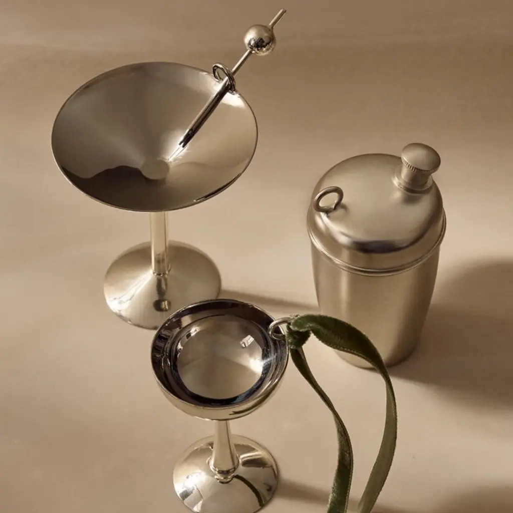 Silver-plated cocktail shaker ornament features a vintage-inspired silhouette complete with a spout. Makes a charming gift. CB2 exclusive.