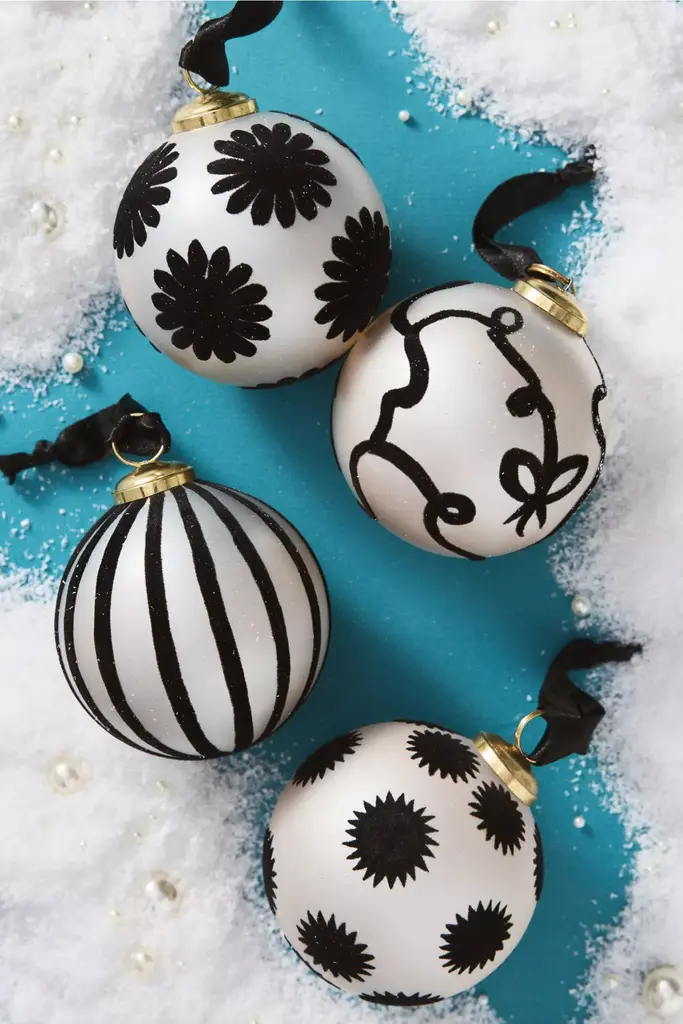 Round glass ornaments are covered with layers of soft white acrylic medium, giving them a soft, minimal texture that adds depth and interest to your tree. Each piece will be unique due to the handmade nature of the ornaments. CB2 exclusive.