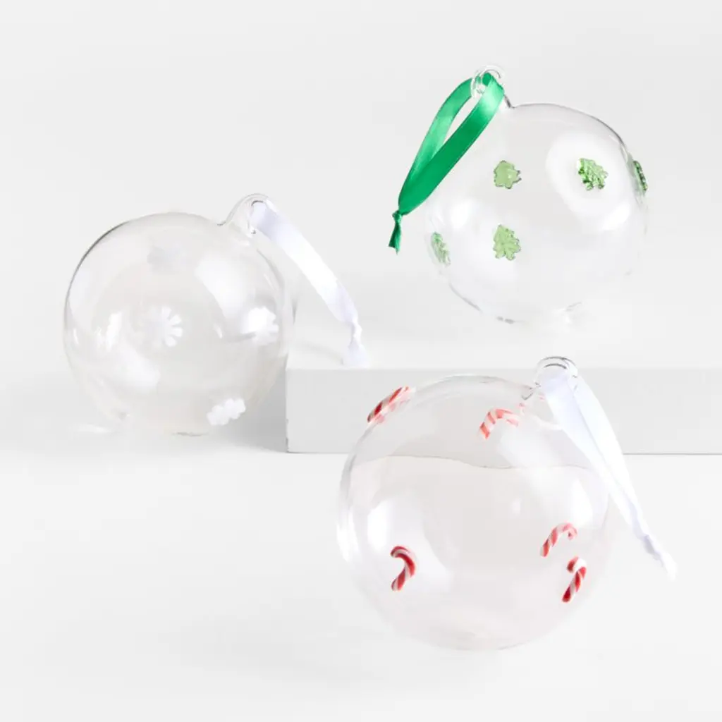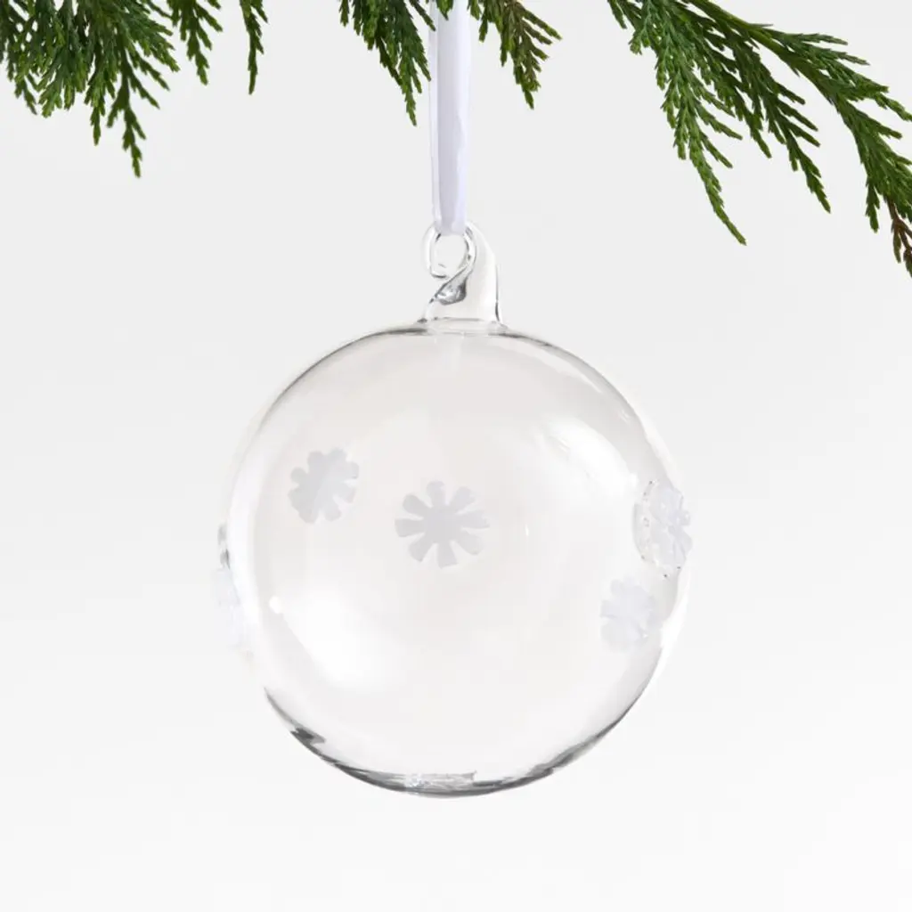 Our exclusive snowflake glass ball Christmas ornament brings a wintry-chic look to your tree. Delicate white snowflake glass charms appear frozen mid-fall on the clear glass sphere. We especially love how Christmas tree lights sparkle and shine through the crystal-clear design to create a moment of magic and wonder.