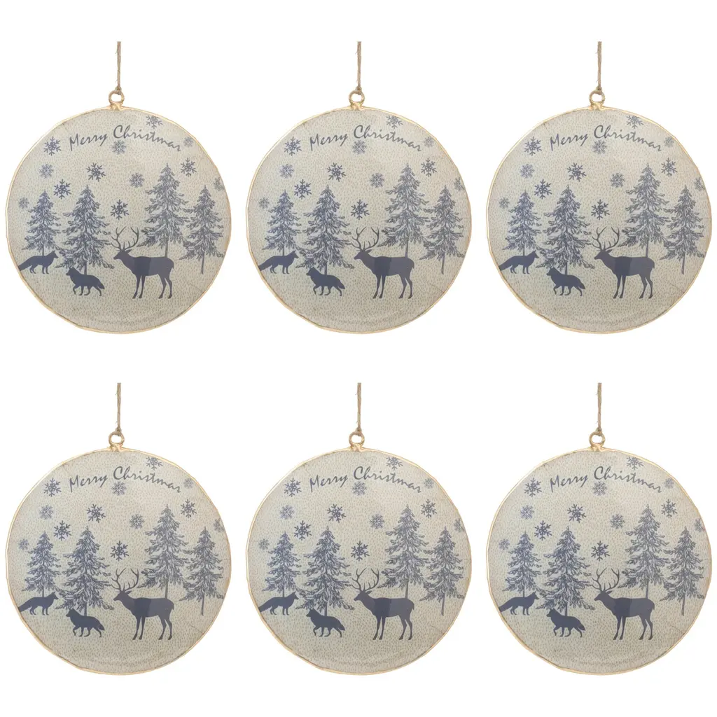 Adorn your Christmas tree with this beautiful set of Snowman and Deer Ornaments. Featuring 12 pieces, this set's festive red and white tones paired with the rustic snowman and deer design and pine branch accents is the perfect combination to create a memorable display. The quality iron metal composition with delicate ribbon tie hanger is sure to endure for seasons to come. Whether you're adding a touch of cheer to your home or gifting to a loved one, these ornaments will definitely bring smiles to your home.