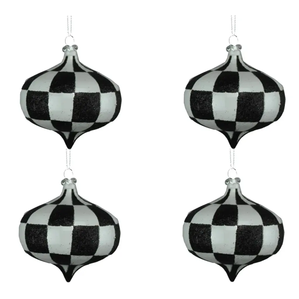 The glitter checkered pattern on these 80mm ornaments is striking. These onion shape ornaments come in a 4-pack with an enamel finish.