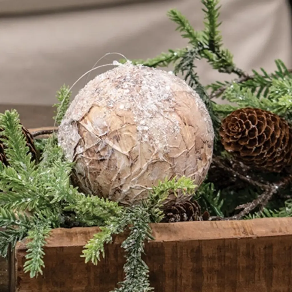 Specification: Description: Add a touch of charm to your winter décor with the Sparkle Birch Ball Ornament, measuring 4 inches in diameter. This stunning ornament showcases a textured birch-style finish adorned with shimmering silver glitter, creating a captivating snowy effect perfect for enhancing any farmhouse or woodland-themed design. Lightweight at just 0.06 lbs, it features a clear string hanger for effortless display, making it an ideal choice for your holiday tree or festive arrangements. Elevate your seasonal decorations with this beautiful 4" ball ornament that seamlessly blends rustic appeal and festive sparkle.