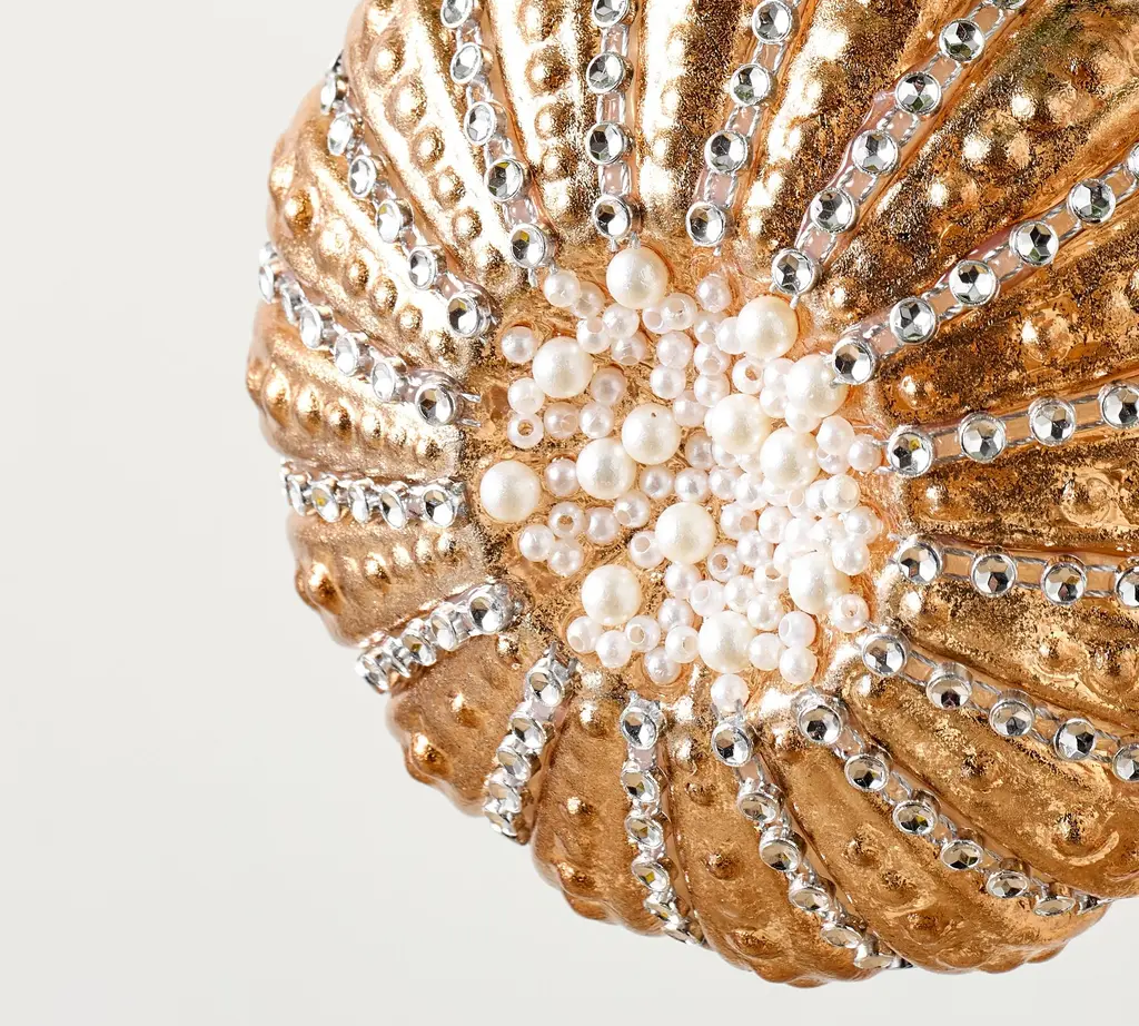 This golden bauble celebrates the sea as much as the season. With its beaded geometry, our urchin makes a luminous addition to an underwater tree-decorating theme. Catch it with our ornament hooks and then layer it into the boughs, along with shell garlands, mercury glass lobsters, and a gleaming turtle or two.