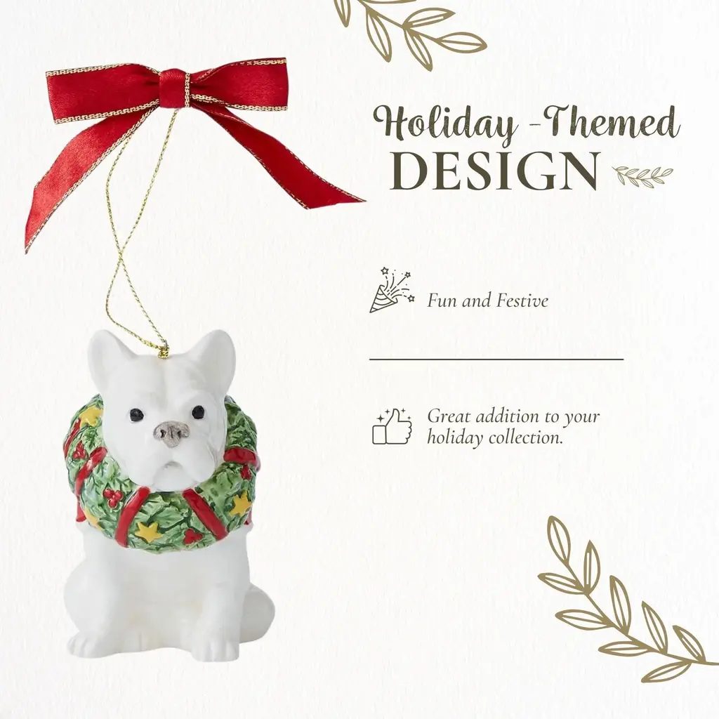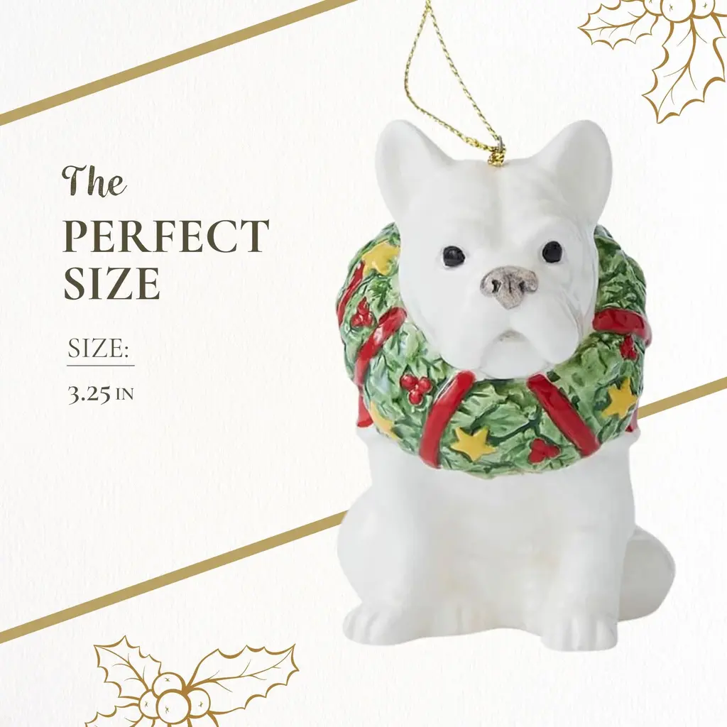 Spode Christmas Tree French Bulldog Ornament, Festive Tree Decoration for Holiday Celebrations with Ribbon Bow for Hanging, Beautiful Seasonal Accent & Classic Home Holiday Décor - NewThe Spode Christmas Tree Collection adds elegance and charm to any holiday decor collection. As part of the well-loved Spode Christmas Tree collection, this ornament is designed to enhance your holiday celebration with its refined design and festive details. This French Bulldog ornament is perfect for decorating your Christmas tree, mantle, or even as part of a seasonal table centerpiece. Its intricate detailing pairs well with any holiday decor style, making it a versatile and eye-catching addition to your home. The attached red ribbon bow makes hanging simple, whether on the tree or elsewhere around the home. Crafted for longevity, the Spode Christmas Tree ornament retains its festive appeal season after season. It’s a great way to bring traditional holiday charm into your home while blending seamlessly with other seasonal decorations. Additionally, it serves as a thoughtful gift idea, perfect for friends, family, or collectors of holiday-themed decor, offering a meaningful way to share the joy of the season. Whether you’re looking to add to your own Christmas tree decoration collection or searching for a special gift, this Spode Christmas Tree ornament is a delightful choice. Its blend of style, tradition, and quality ensures that it will be a cherished part of holiday celebrations, adding warmth and festive spirit to any home.FEATURES:COLOR:MATERIAL:WHAT'S IN THE BOX:PACKAGING:Retail Packaging