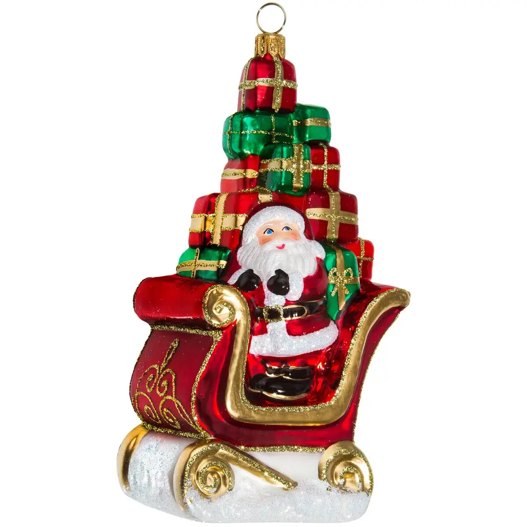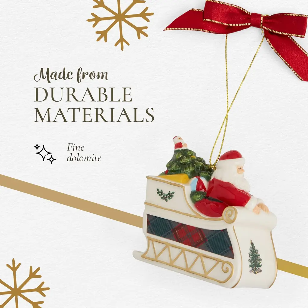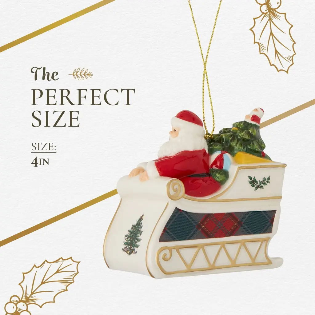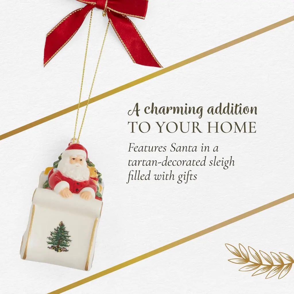 Spode Christmas Tree Tartan Santa in Sleigh Ornament - Christmas Tree Decorations with Tartan Plaid, Festive Holiday Ornaments for Christmas Trees, Mantels, Home Displays - Collectible Holiday Decor - NewLook who has a new ""ride""-- Santa In Sleigh ornament from Spode features Santa in a tartan decorated sleigh filled with gifts for his Christmas deliveries. A whimsical ornament for the tree. Celebrate the festive season with the Spode Christmas Tree Tartan Santa In Sleigh Ornament, a charming and colorful addition to your holiday décor. This ornament features a playful stack of gifts wrapped in bold tartan plaid and adorned with holly accents, capturing the essence of holiday cheer. As part of the beloved Spode Christmas Tree Collection, which has been a favorite among families since 1938, this ornament brings both nostalgia and modern festive flair to your home. The Spode Christmas Tree Tartan Santa In Sleigh Ornament is a versatile piece that can be displayed on your Christmas tree, mantel, windowsill, or as part of a holiday centerpiece. Its vibrant colors and festive design add a cheerful atmosphere to any room, whether you're hosting family gatherings or simply enjoying the season at home. This ornament reflects the warmth and joy of Christmases past, making it a meaningful addition to your collection. Crafted from fine dolomite, this holiday ornament is designed to last throughout many holiday seasons, ensuring that it remains a cherished part of your festive displays. The combination of tartan plaid and holly details gives it a unique and festive look that stands out, yet blends easily with other Christmas tree decorations. Whether your style leans traditional or modern, this ornament offers a delightful touch that complements a wide range of holiday décor.FEATURES:COLOR:MATERIAL:WHAT'S IN THE BOX:PACKAGING:Retail Packaging