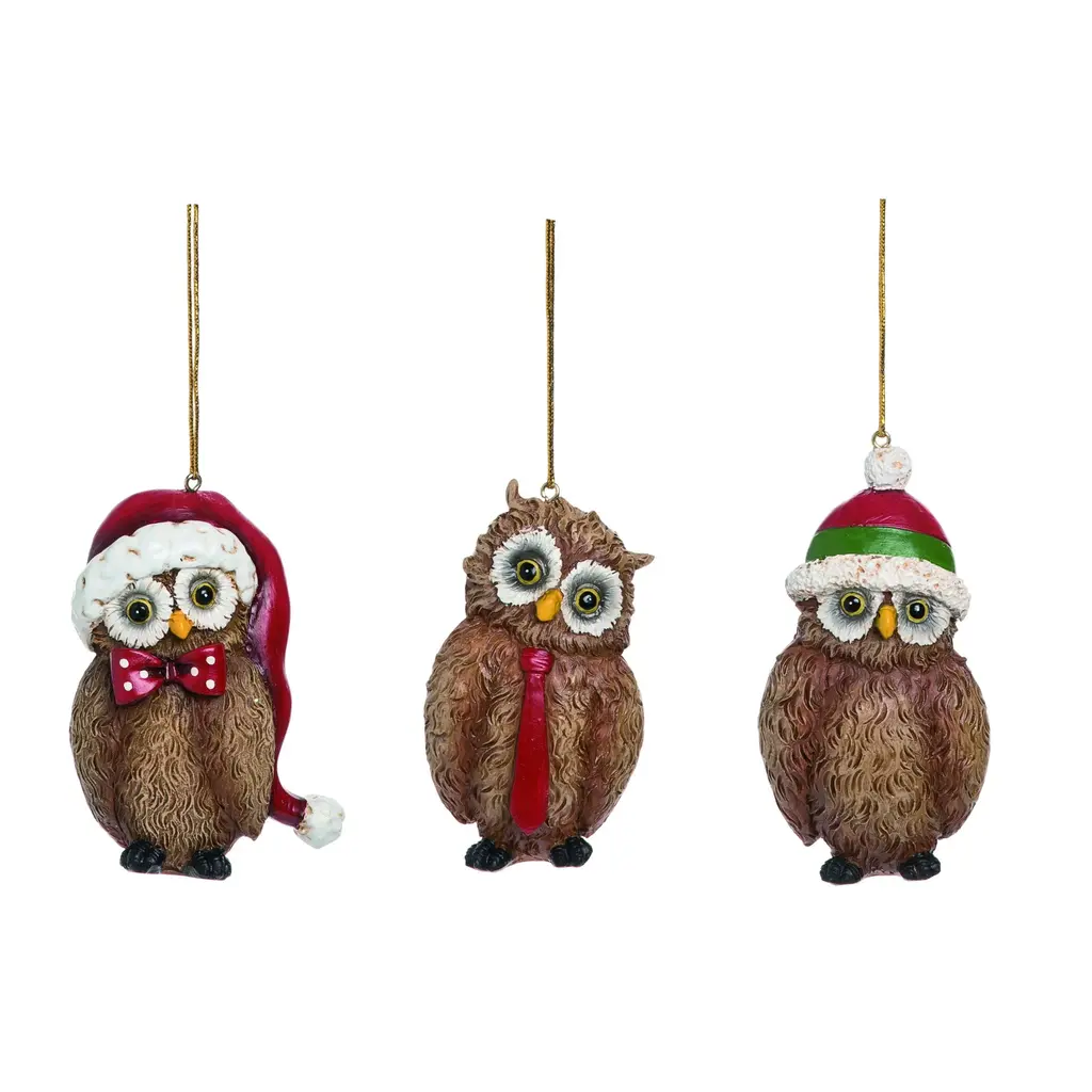 Our unique posing owl figurine ornament is an ideal gift or home decor piece. With its distinctive design, this owl adds character to any space. Perfect for shelves, mantels, or as a centerpiece, it offers versatility and eye-catching appeal, making it a must-have for enhancing your seasonal displays and adding a festive touch to any occasion. Product Features: Gray and white owl figurine ornament Showcases a three unique posing owls Owls are accented with Santa hat, scarf and antlers Comes equipped with sturdy hanging loops Perfect addition to any Christmas tree, garlands, mantles, or as a gift For indoor use only Care instruction: dry or spot clean Dimensions: 3.5"H x 2.25"W x 2.25"D Material(s): resin Note:Set includes 1 of each item for a total of 3