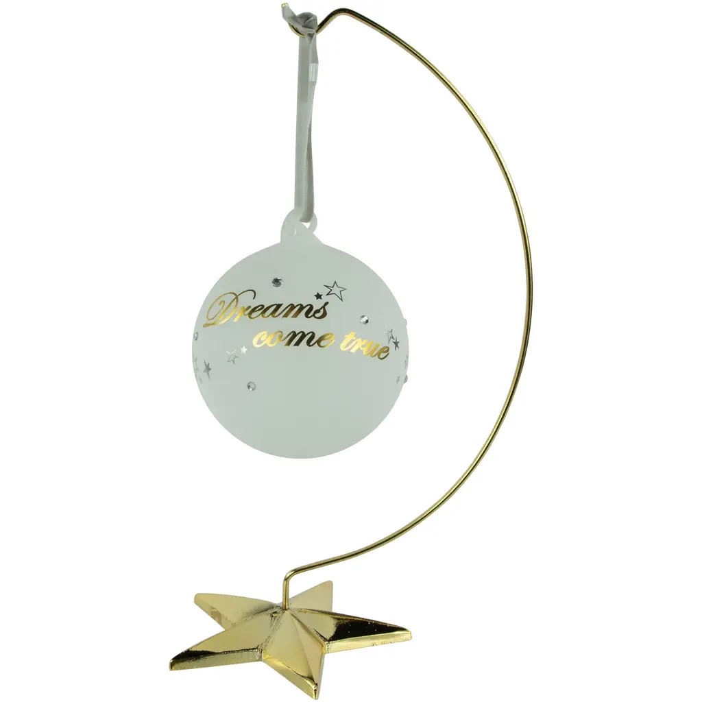 Celebrate the magic of the holiday season with this Christmas ornament holder. This beautifully designed ornament holder features a shining gold star at its center and a hook to showcase your favorite Christmas ornament. The shimmering gold finish adds a touch of sparkle to your home decor. Whether you're looking to display cherished family heirlooms or create a stunning holiday centerpiece. Product Features: Gold star ornament holder Features a gold star-shaped base and hook A unique gift idea for an ornament collector For indoor use only Dimensions: 12.5"H x 8"W x 5"D Material(s): metal