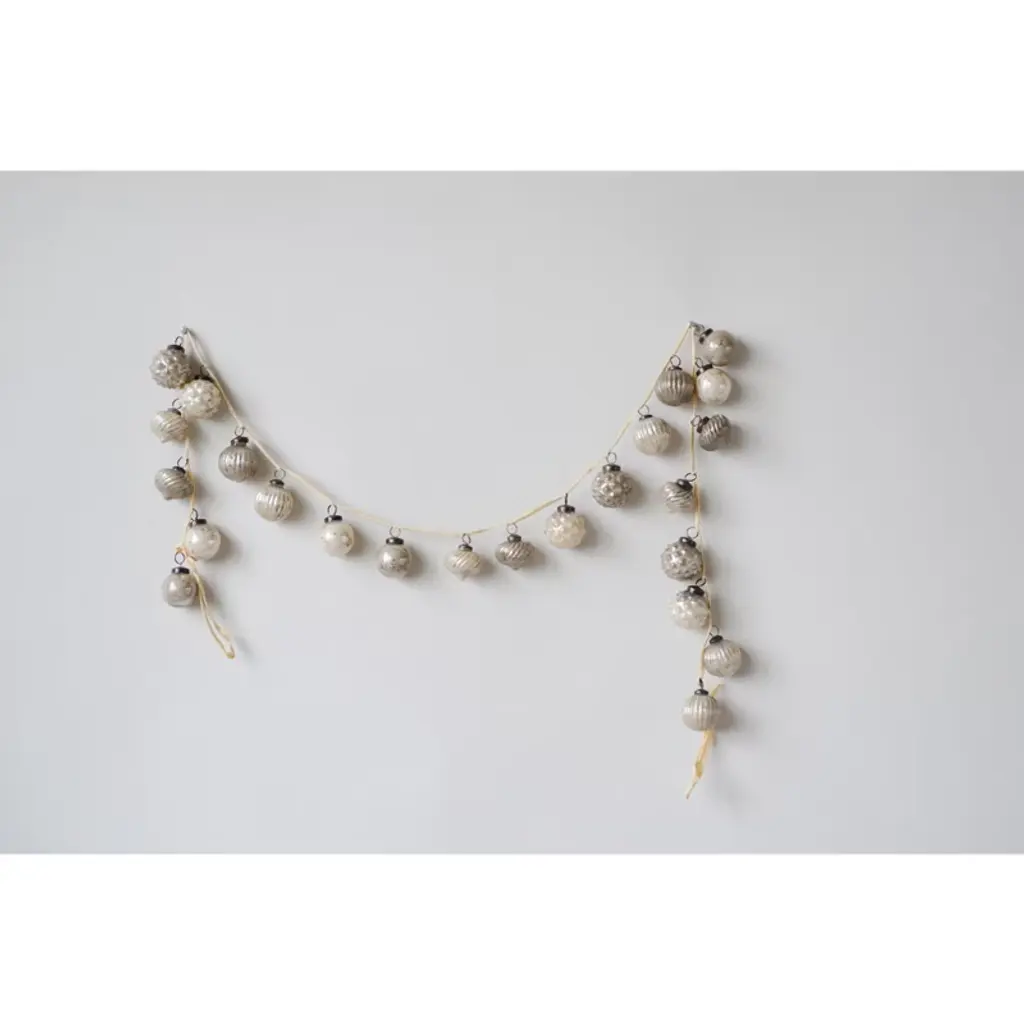 Enjoy the various designs of these glass ornaments. They are attached to a fabric string and create an antique garland to be envied by all. Lay it on a surface around larger items, add to a decorative piece filled with other items, hang on a fireplace mantel or in front of a window.
