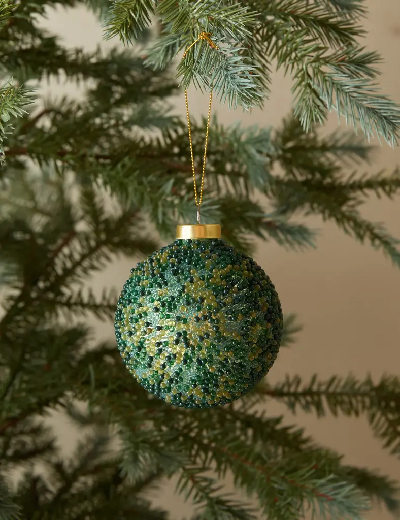 This elegant piece is amazing for any holiday décor. Striking green fully dimensional ornament embellished with clear glass beads. Equipped with gold ornament caps for easy hanging on trees, garlands and wire.