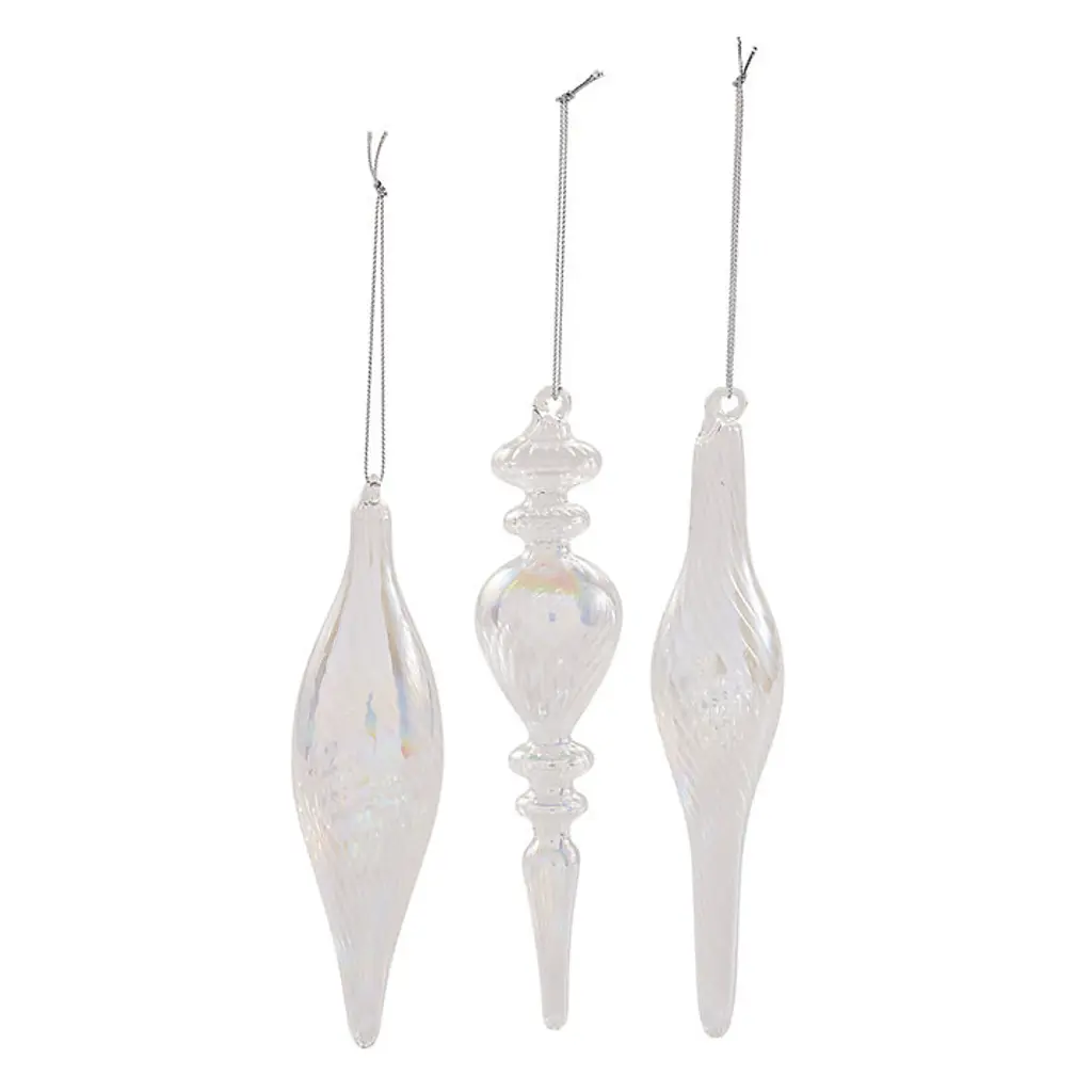 Old-world charm for your holiday tree. Our Glass Icicle Ornaments are hand crafted of swirled, mouth-blown glass and meticulously hand finished to create the rainbow-like, iridescent finish. Each ornament in this set of three features a different heirloom shape and has a tiny hole in the top for your own hanger. Swirled Glass Icicle Ornament features: