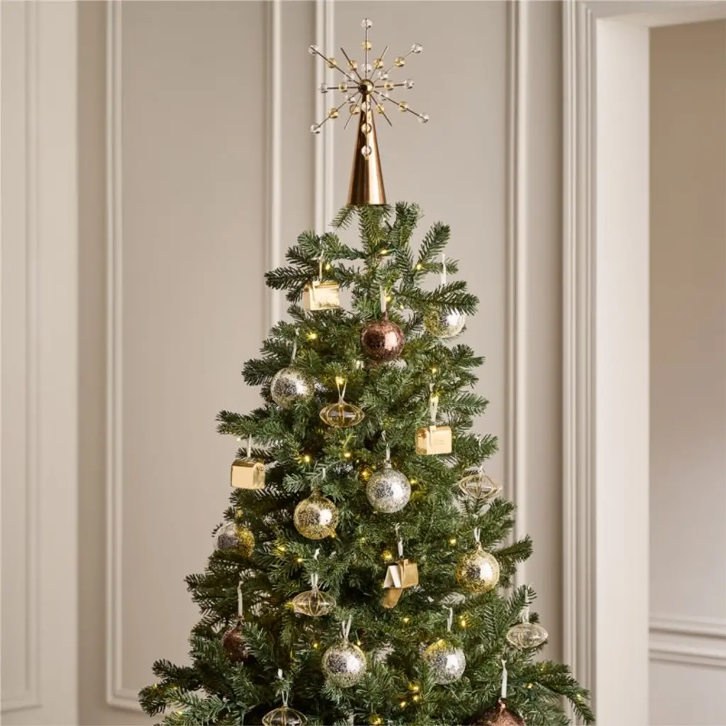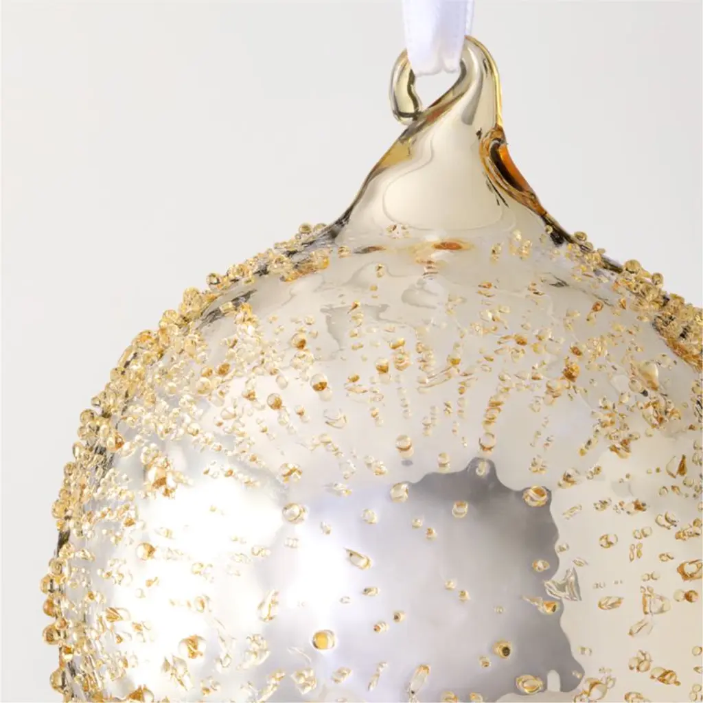 Textured glass ball ornaments in warm gold, silver, champagne and bronze shine among the lights of the Christmas tree. CB2 exclusive.