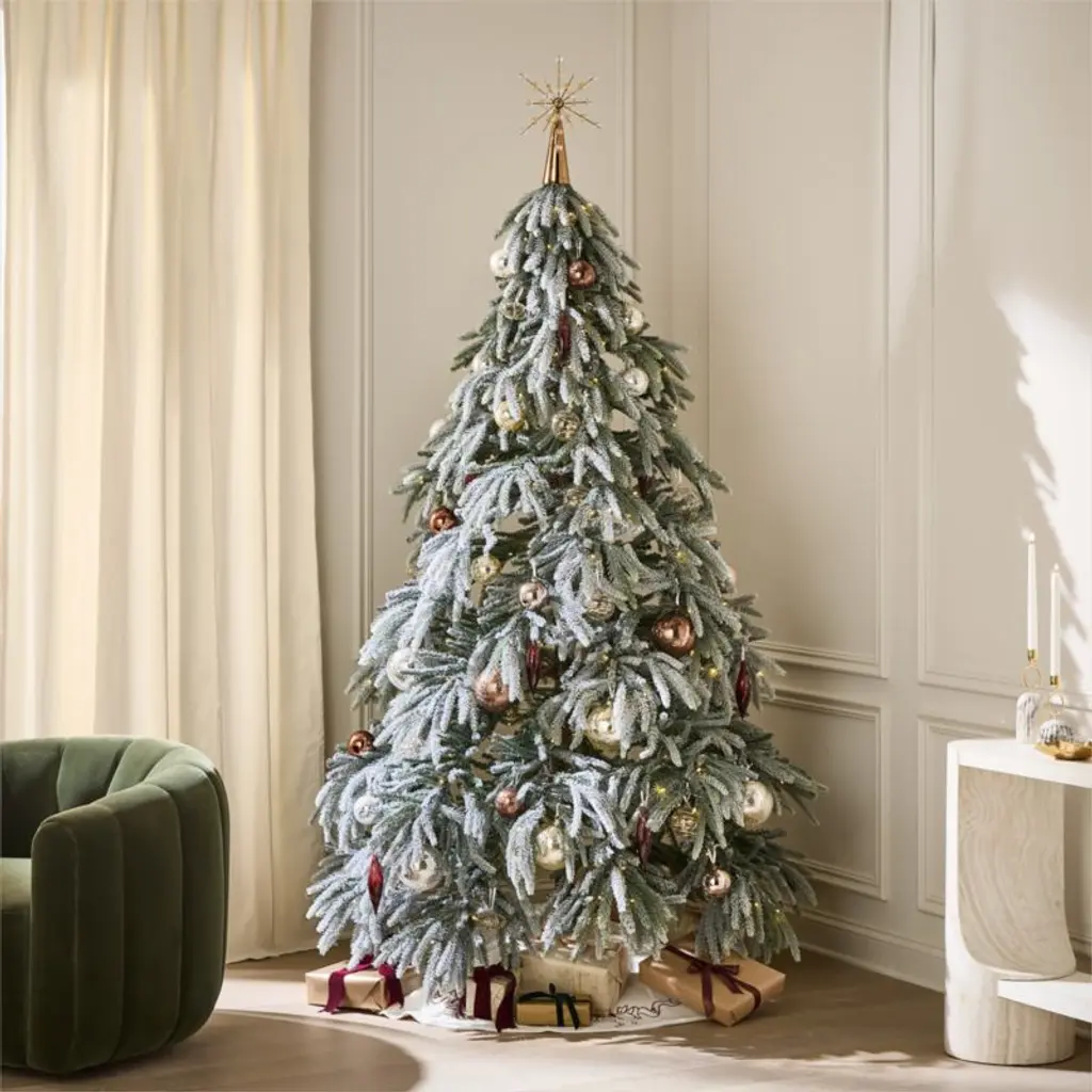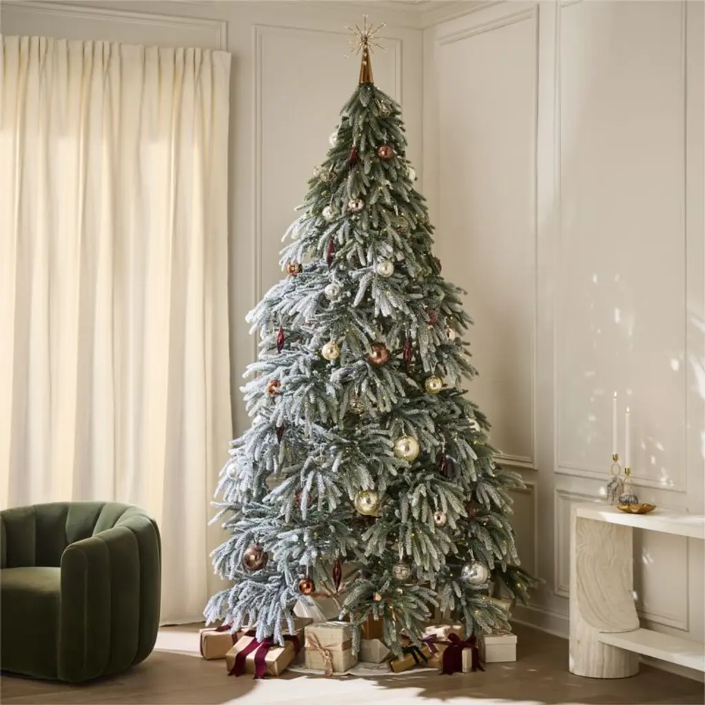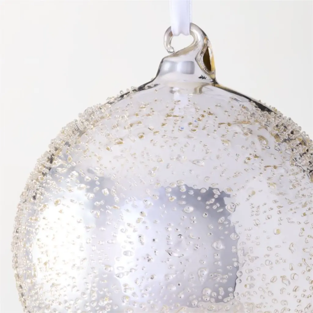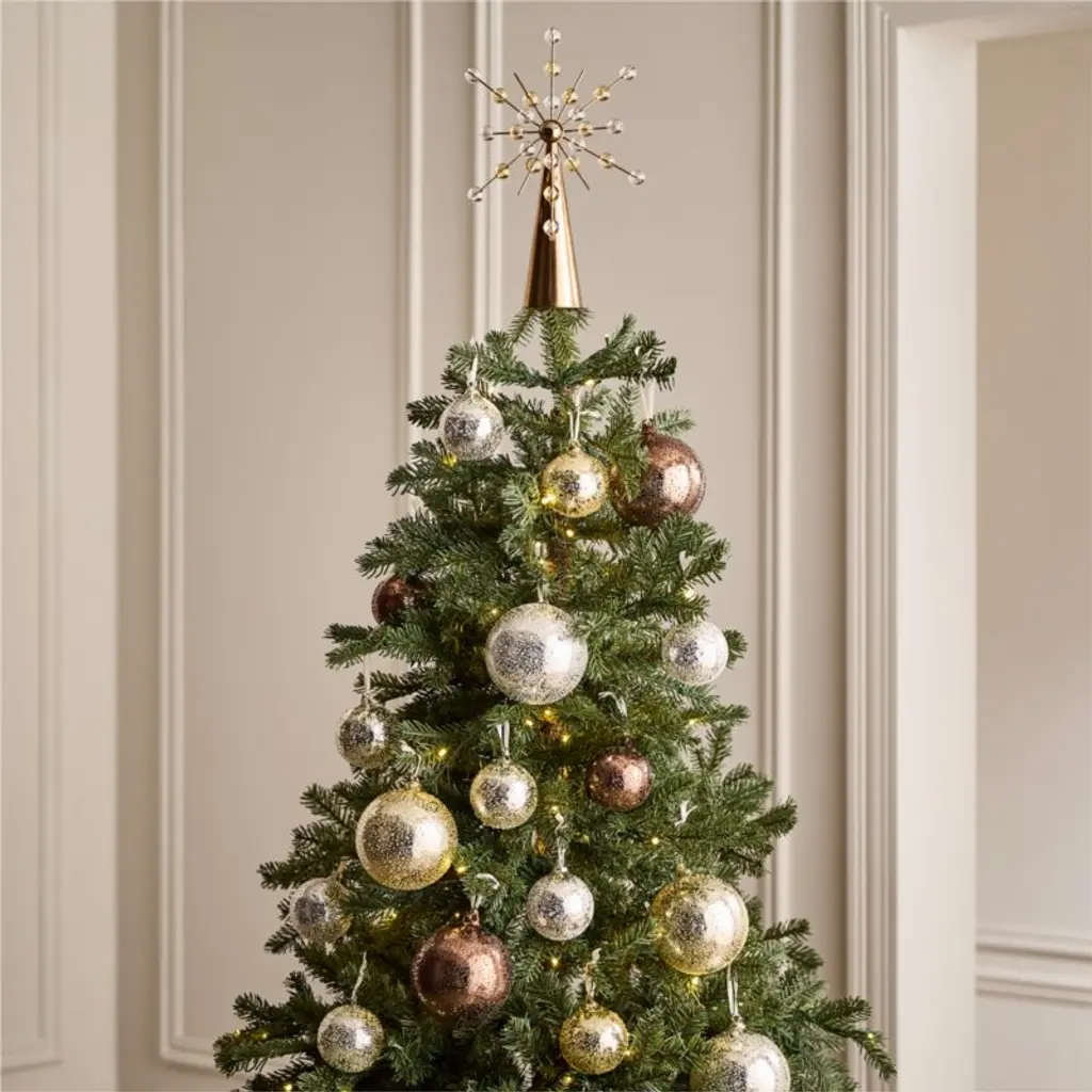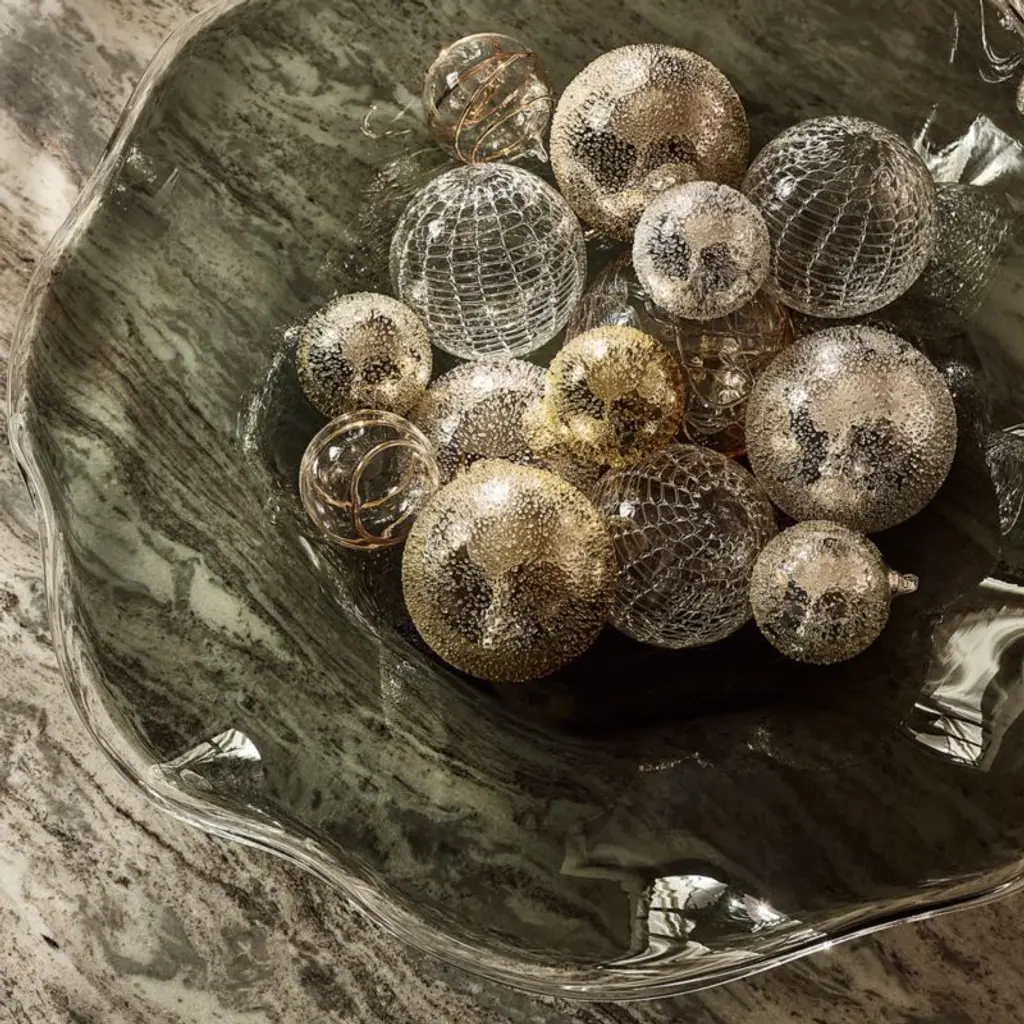 Textured glass ball ornaments in warm gold, silver, champagne and bronze shine among the lights of the Christmas tree. CB2 exclusive.