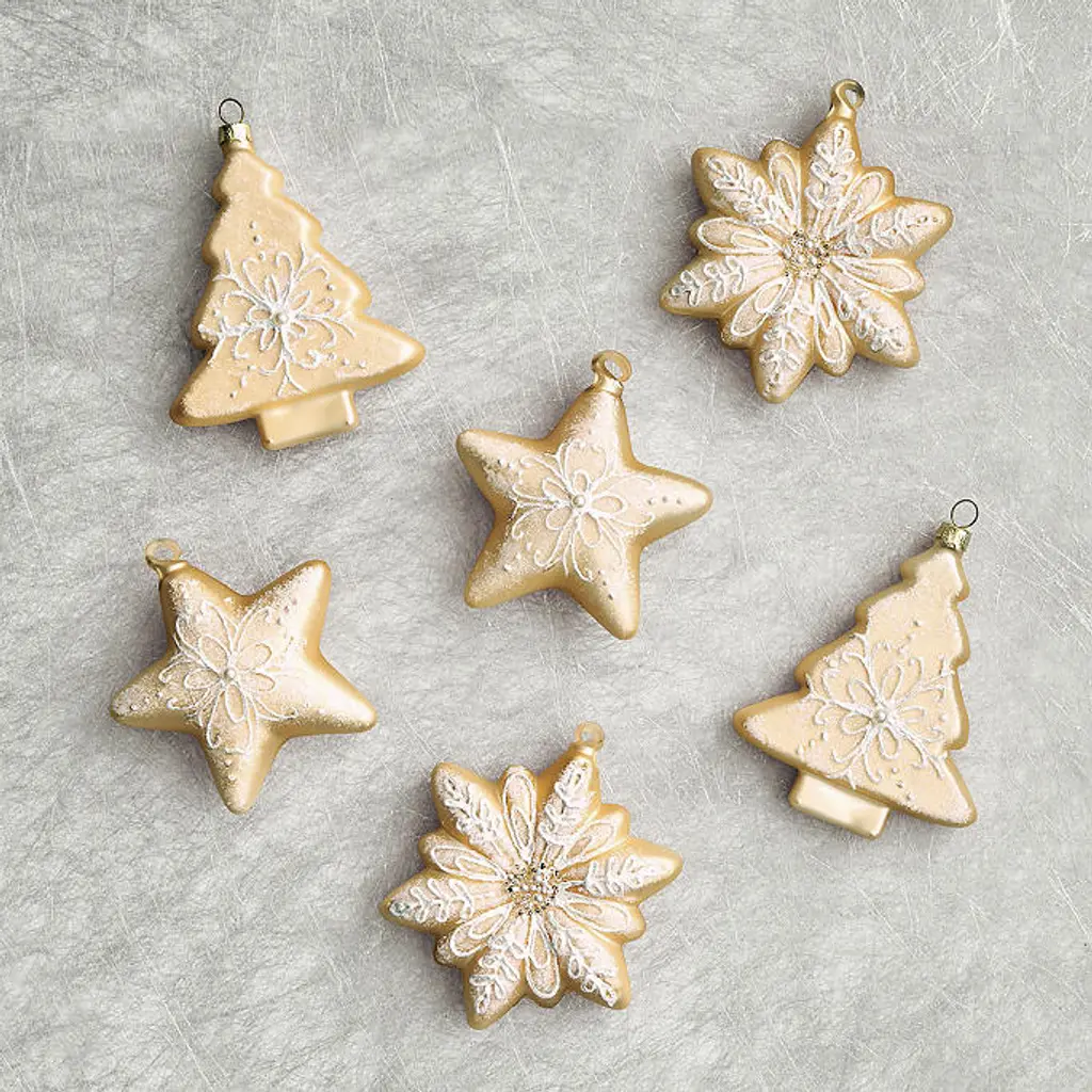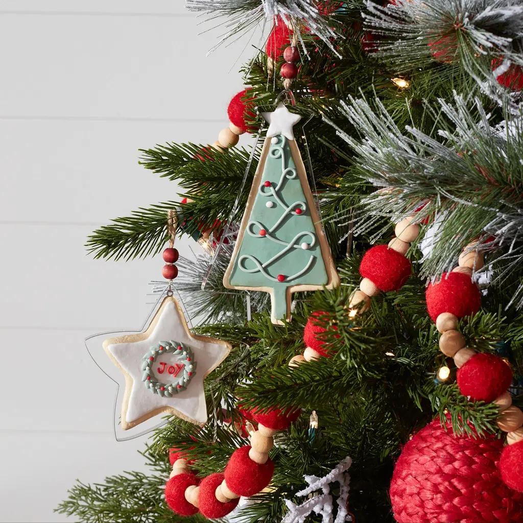 Elevate your Christmas tree with a dash of nostalgia using this delightful set of star and tree cookie cutter ornaments. These charming frosted cookie designs, complemented by rustic wood bead accents, create a captivating and traditional display. Adorned with jute string hangers, these ornaments are built to last for many joyful seasons. Whether adorning your home or gifting to a loved one, these ornaments will surely bring smiles and cherished memories to your holiday celebrations. Product Features: 12-piece set Color: multi-color Tree and star ornaments Comes with cookie cutter design Decorated with wood bead accents Comes ready-to-hang on a jute string Perfect addition to your Christmas tree decoration For indoor use only Dimensions: Tree ornament: 6.5"H x 4"W x 0.5"D Star ornament: 4.5"H x 5"W x 0.5"D Material(s): clay dough/metal/wood/jute Notes:Set includes 6 of each item shown for a total of 12
