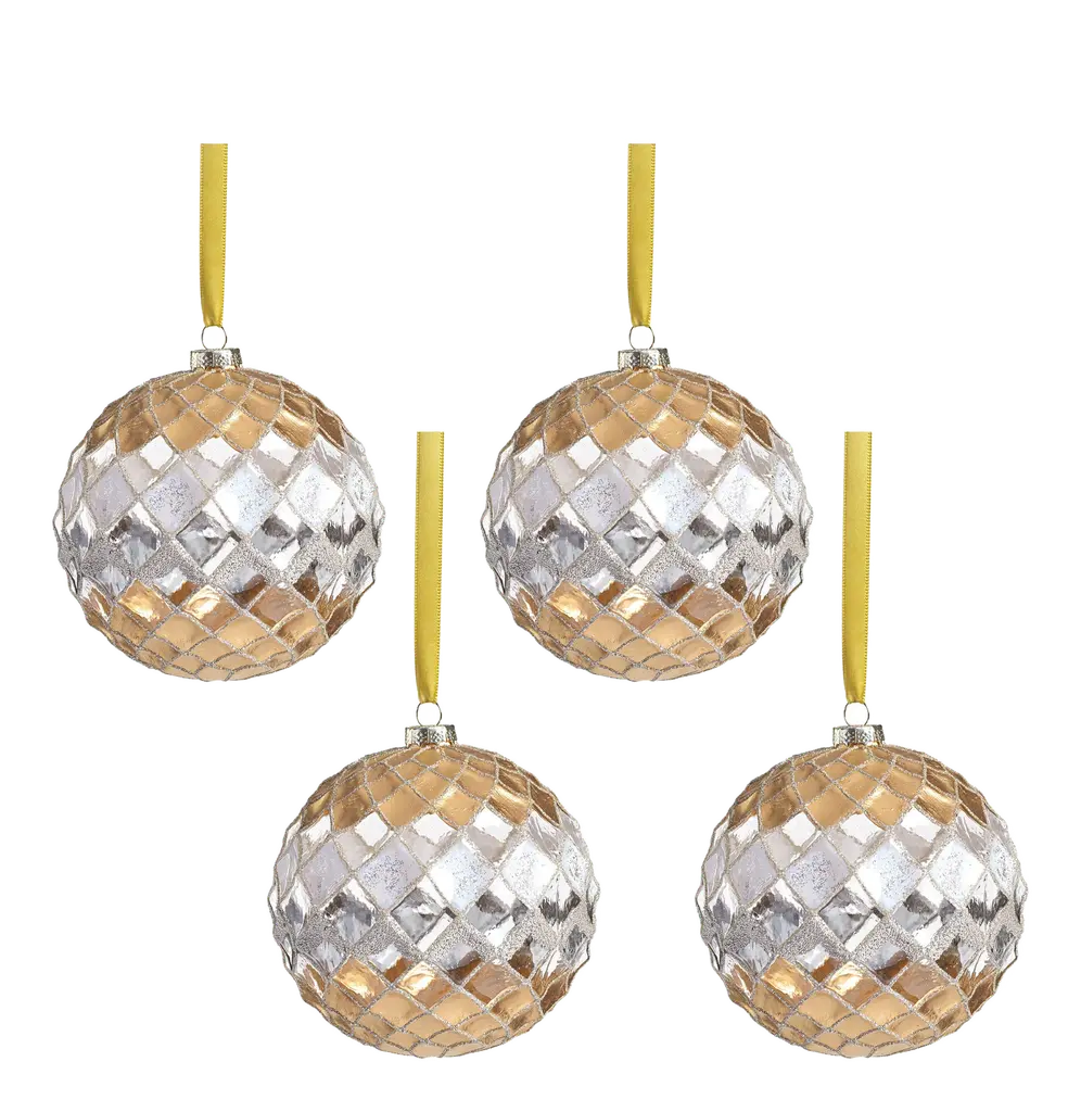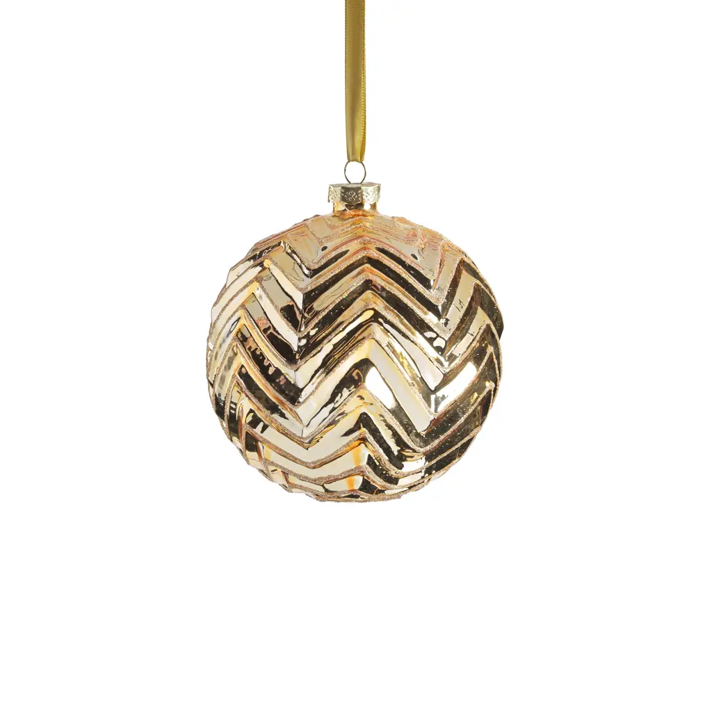 Introduce a contemporary flair to your holiday decor with the Trieste Metallic Chevron Glass Ball Ornaments. These stylish ornaments feature a sleek metallic shiny finish that adds a modern touch to any setting. The embossed zigzag pattern enhances their visual appeal, creating a dynamic and textured look. Perfect for your Christmas tree or as decorative accents, the Trieste Metallic Chevron Glass Ball Ornaments will infuse your festive season with elegance and sophistication. Features: Set of 4 hanging ornaments of the same size Metallic finish Glittered chevron pattern Equipped with ornament cap Comes ready to hang Perfect addition to your Christmas tree decor