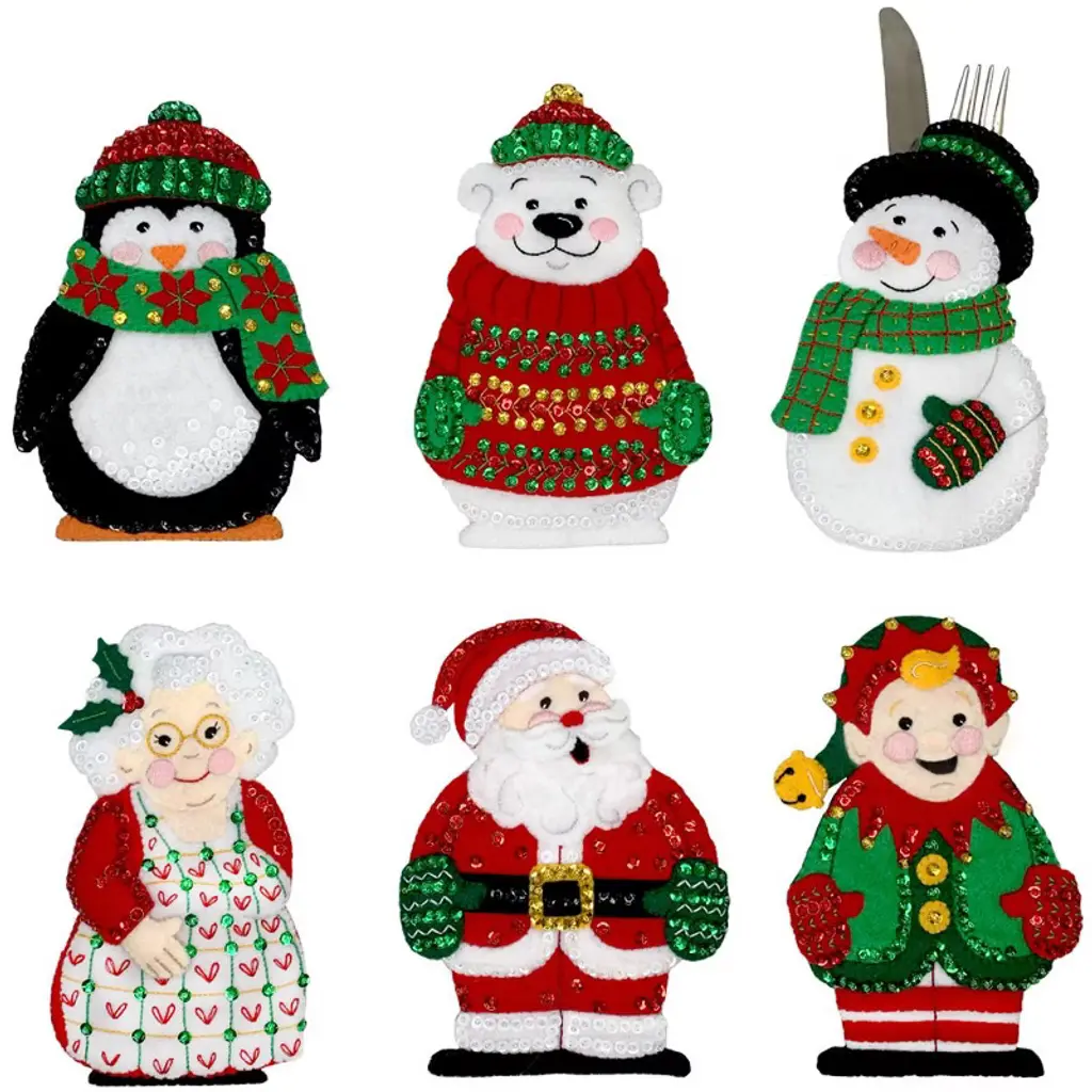 Add cozy holiday charm to your décor with the Holiday Sweater Bear Felt Ornament Kit Set. This four-ornament collection features cheerful bears dressed in festive sweaters and Santa hats, each with its own unique design—Santa suit, Ho Ho Ho, Christmas tree, and candy canes. With bright colors, shimmering sequins, and layered felt details, these ornaments are a joyful way to bring handmade warmth to the season. Includes pre-stamped USA made felt, DMC floss, sequins, beads, needle, and complete instructions for all four ornaments.