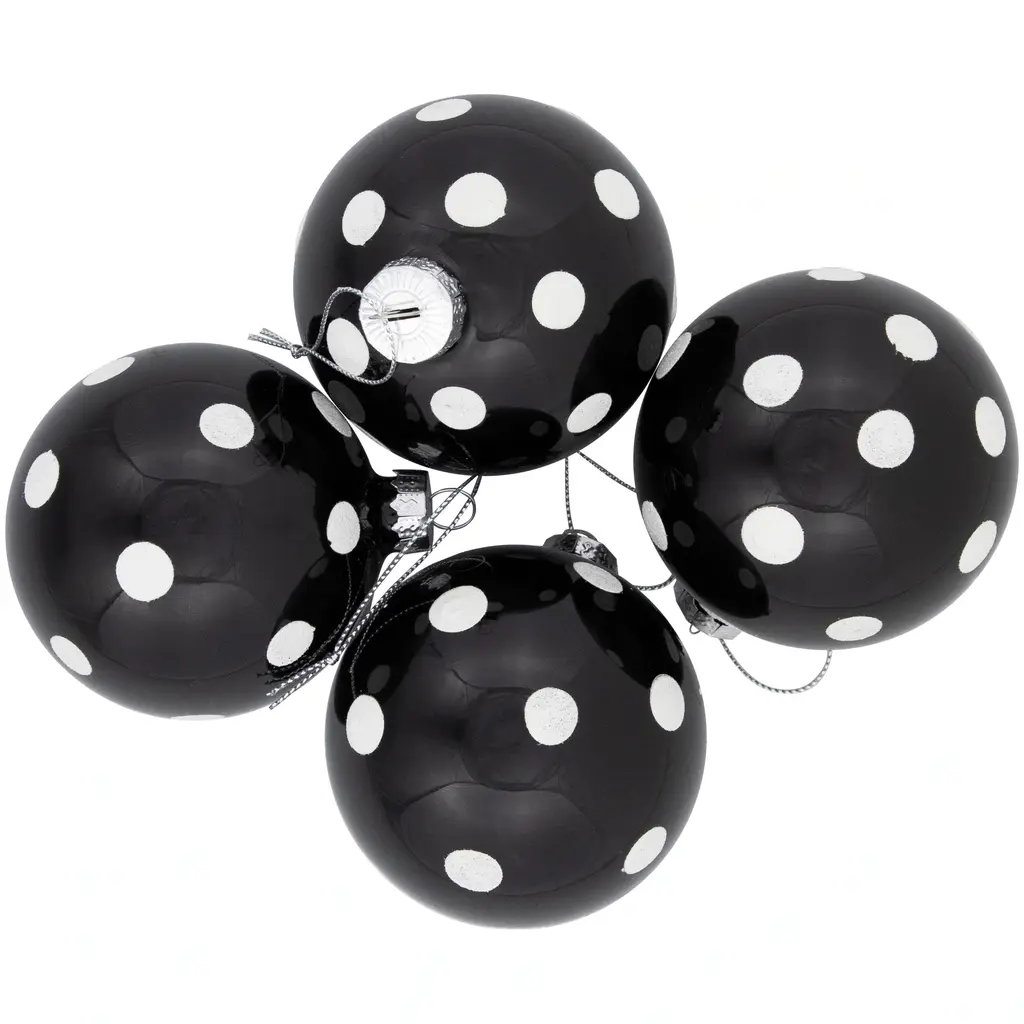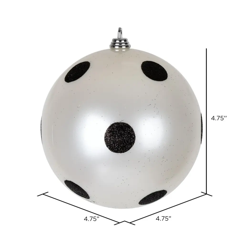 Vickerman 4.75" White Candy Finish Ball Ornament with Black Glitter Dots. This item features a candy finish with a glitter polka dot design for an eye catching look as well as a metal cap for reliable hanging. This unique ornament is an exceptional addition to any collection as it matches well with a variety of décor and goes perfectly on a holiday tree. Includes 4 ornaments per pack.