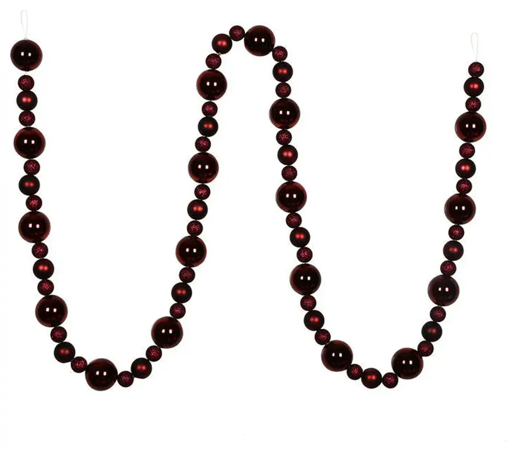 Brighten up your holiday decor with this eye-catching Vickerman 9'' long Red Assorted Christmas Ball Ornament Garland. This brilliantly colored red garland consists of varied sizes of ball ornaments that are made of shatterproof plastic and feature a sparkling mix of shiny, matte, and glitter finishes. It makes the perfect addition to any holiday decorating project. Incorporate it into your tree''s decorations, wrap it around a staircase banister, drape it around a door frame, or string it along your fireplace mantel.