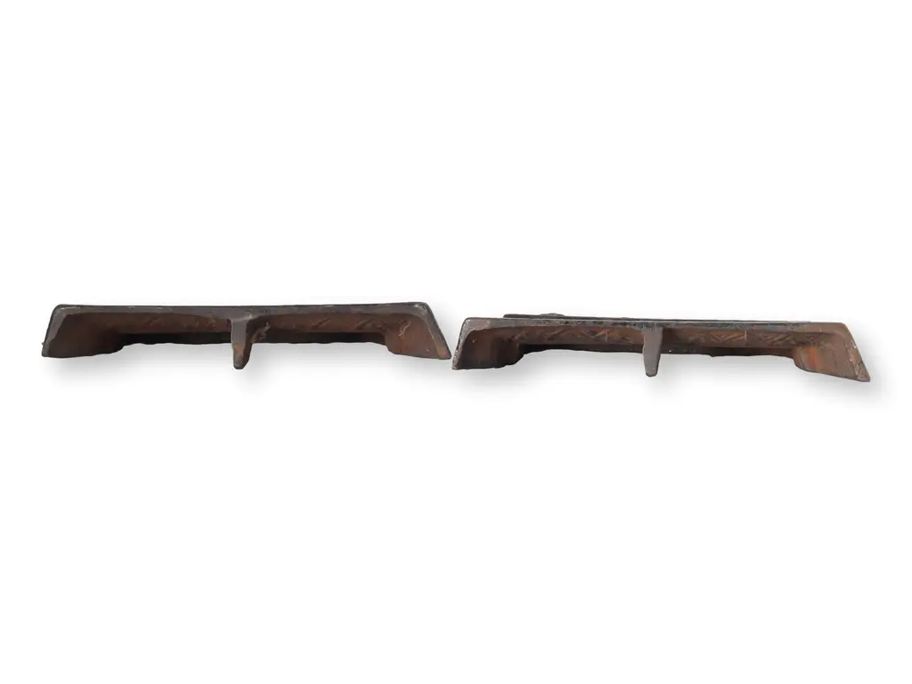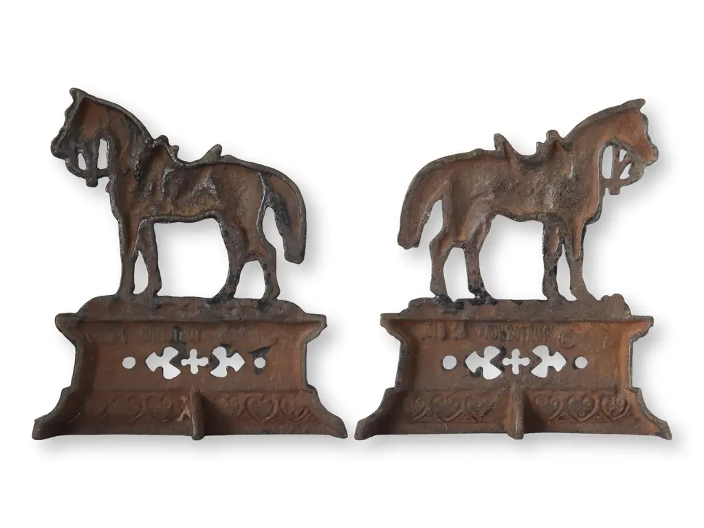 These Antique English Victorian cast iron horse ornaments, originally intended as fireplace adornments, possess a timeless elegance that also makes them ideal as bookends. The detailed casting captures the noble stance of the horses, reflecting the craftsmanship of the period. Their substantial weight and intricate base designs, featuring classic motifs, ensure stability and add a touch of distinguished charm to any bookshelf or mantelpiece.