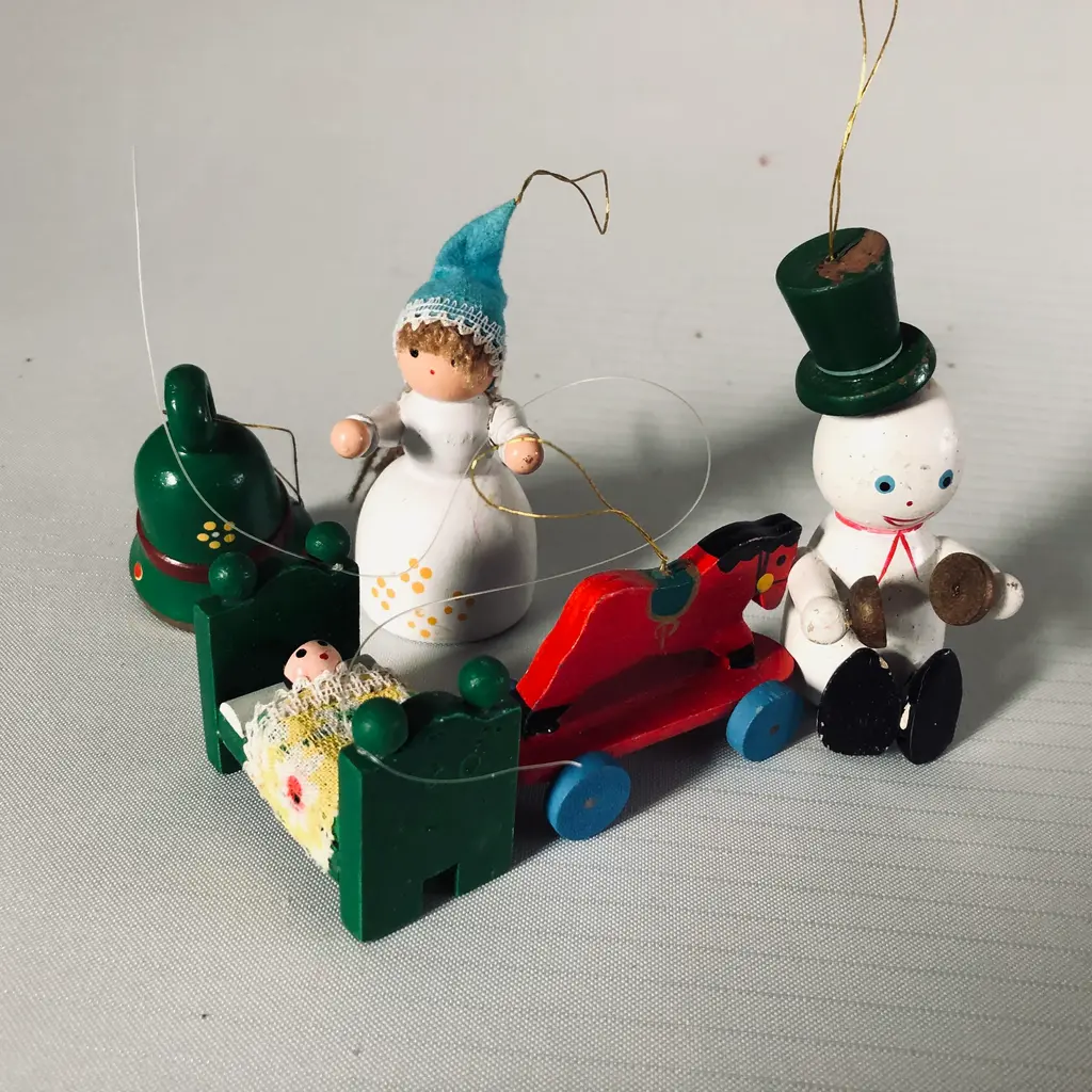 Vintage wooden painted set of 5 Christmas ornaments Highest 3.25"H , makers mark reads " BRINN's PGH , PA Made in Taiwan " They are in very good condition.
