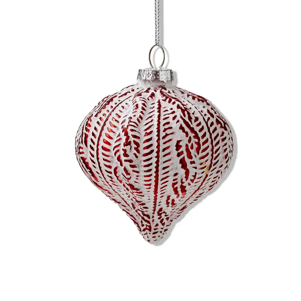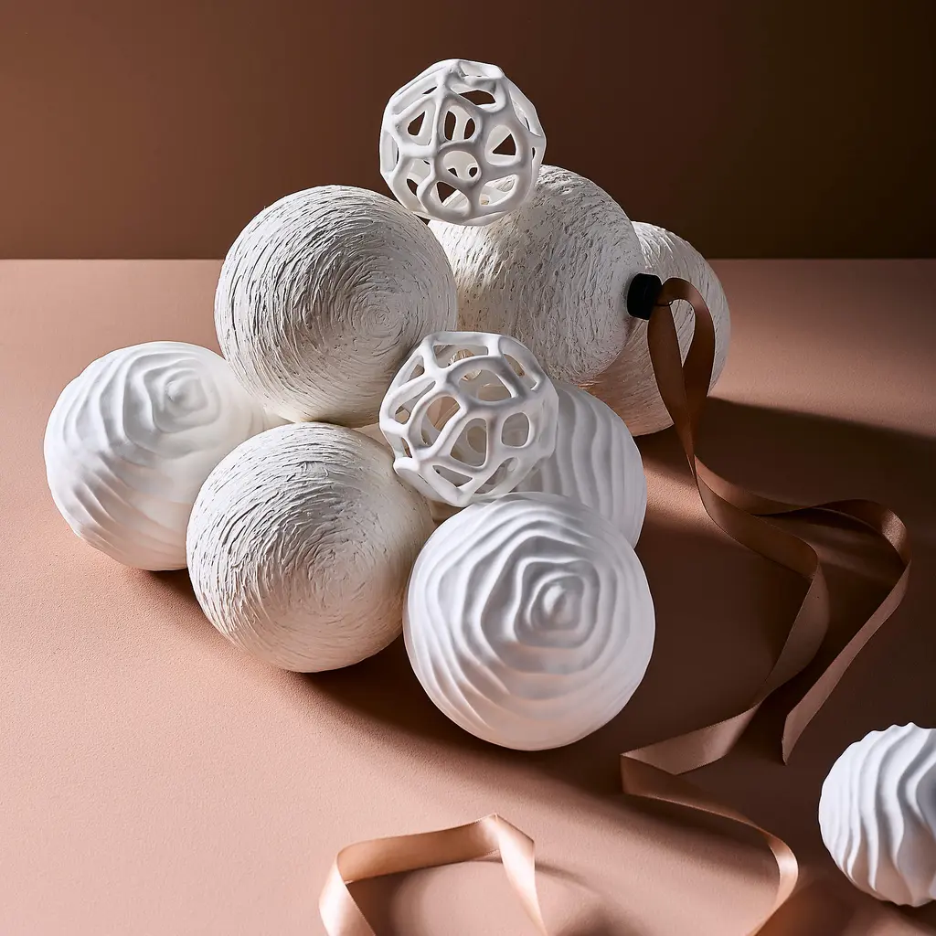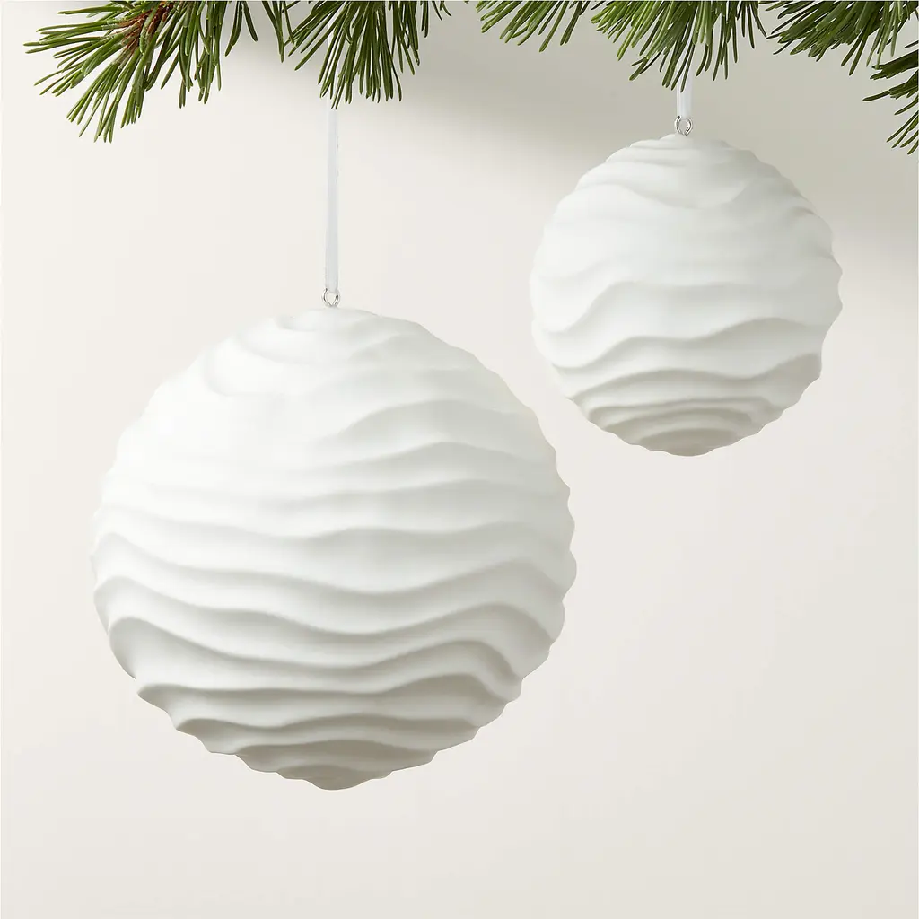 Fine bone porcelain is hand-poured into a mold, then slip cast to create this matte white ornament with an understated undulating texture. Pair this size with its larger counterpart for a stunning look. Because each ornament is cast by hand, slight variations will occur. CB2 exclusive.
