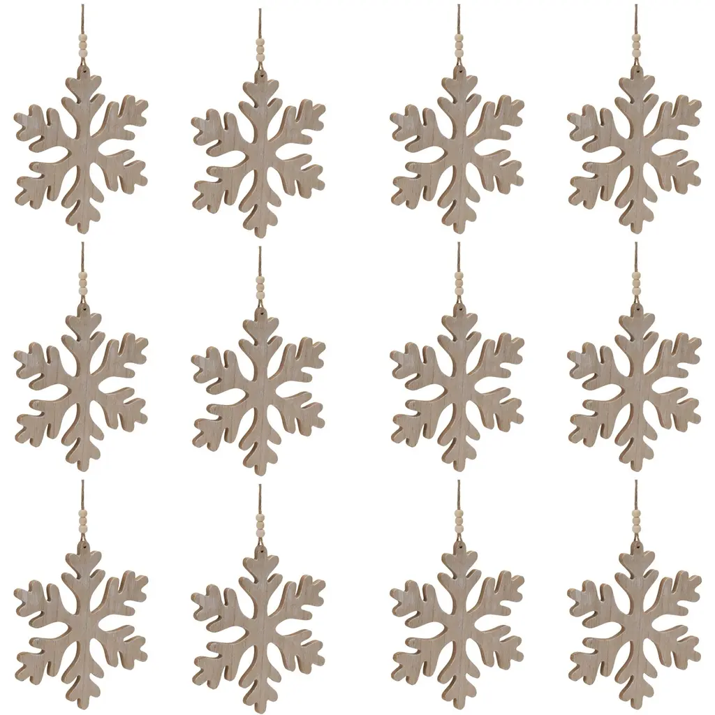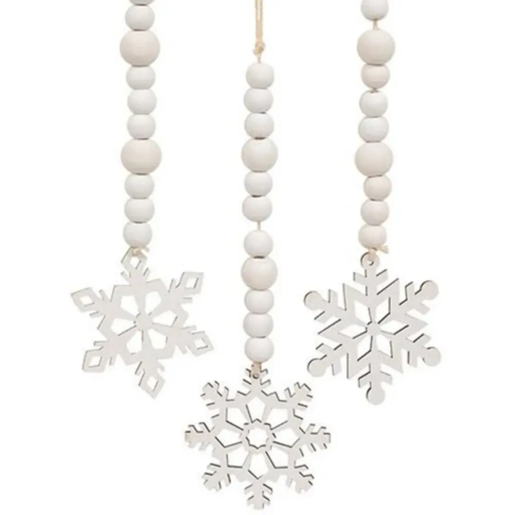 White Snowflake Wood Beaded Ornament comes in four assorted variations. Each snowflake has a unique shape and is lightly distressed. The ornament hangs on a jute string that is accented with alternating natural and white painted wood beads. Features