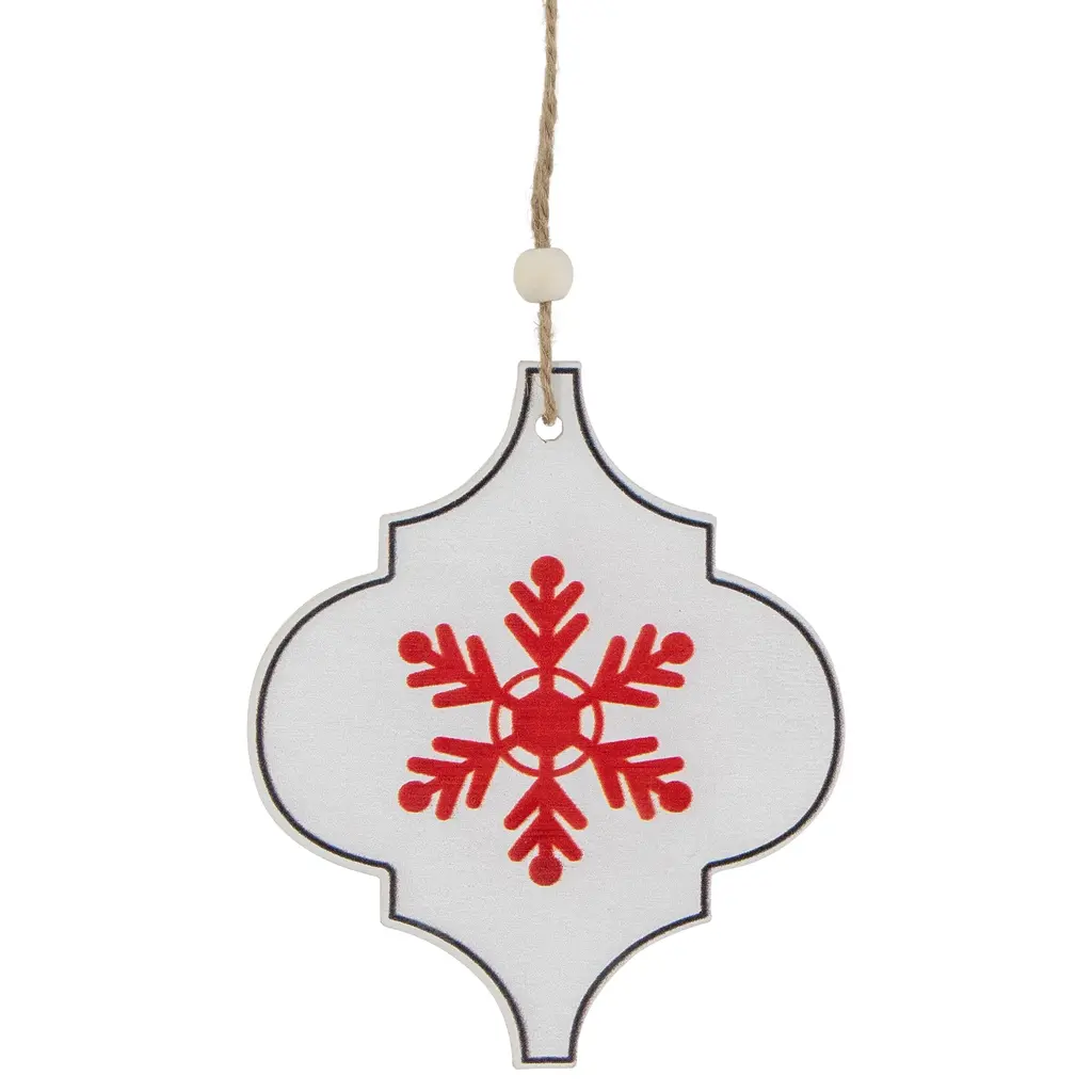 Add a unique touch to your holiday décor with this white and red wooden bauble Christmas ornament. Featuring a one-sided, classic snowflake design, its perfect for bringing a cozy, winter vibe to your tree. The twisted jute rope with a natural wooden bead makes it easy to hang the ornament wherever you like. Whether you're looking to decorate your own tree or to give as a thoughtful gift to someone special, this ornament is sure to delight. With its classic design, this ornament will be a cherished addition to your holiday collection for years to come. Product Features: Christmas bauble wooden ornament Pictures a 6-point red snowflake Thin black lined border Comes ready-to-hang on a jute rope Natural wooden bead accents the jute rope One-sided ornament For indoor use only Unlit Dimensions: 4.5" high x 3.75" wide Material(s): MDF/wood/jute