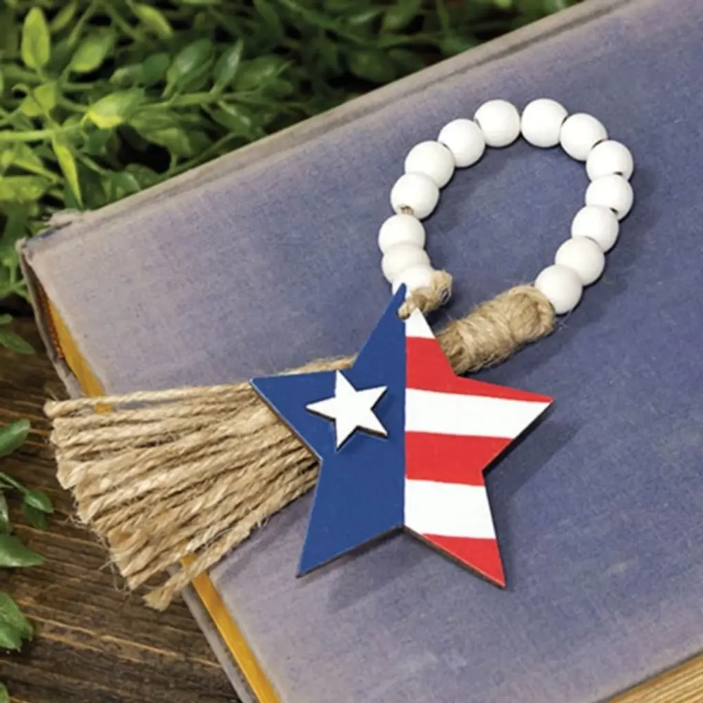 Specification:Description:The Americana Star Ornament is a decorative wooden cutout star figurine with a red, white, and blue American-flag design. The star is attached to a length of jute rope, strung with round white beads and finished with a tassel. Display this ornament draped on a tree, tray, or frame for a fun accent in the home during the patriotic season. Measures 12” long, star measures 2.5” by 2.25”.