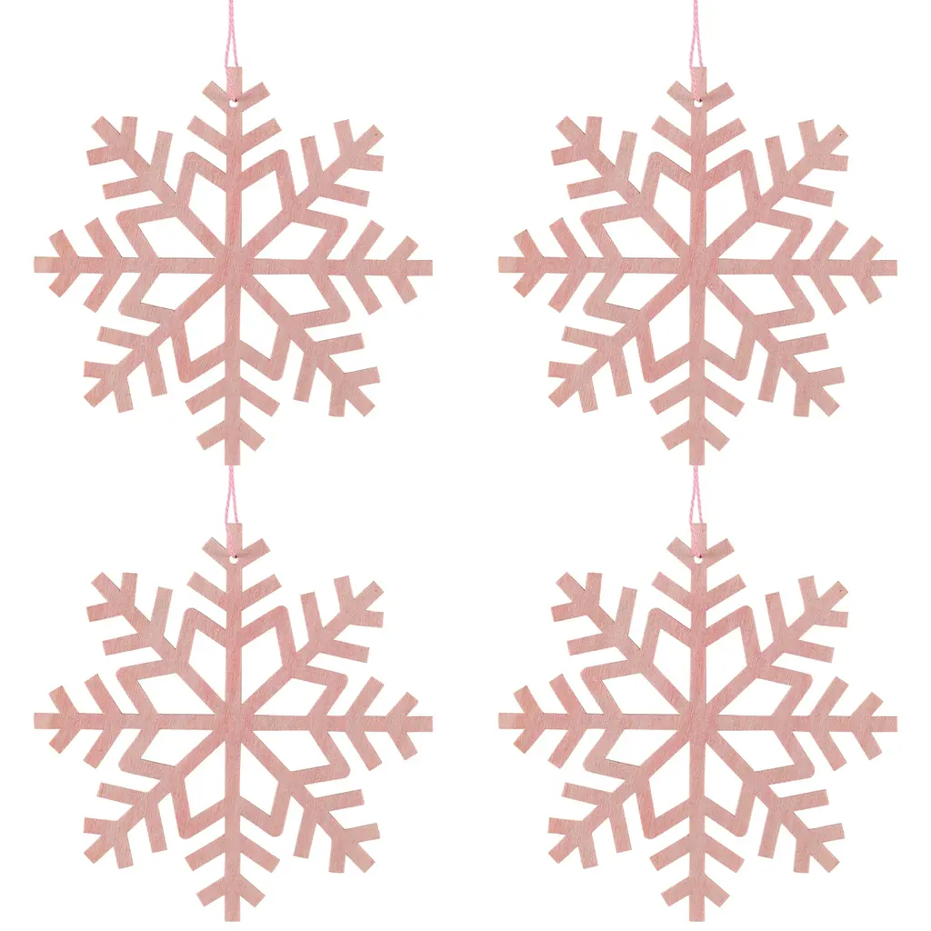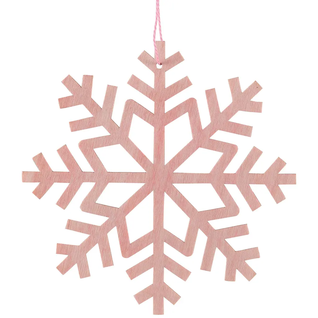 Add a touch of rustic charm to your holiday decor with this set of pink wooden snowflake Christmas ornaments. Crafted from natural wood these ornaments depict an intricate laser-cut snowflake design. Double-sided and flat they hang elegantly from jute twine ready to adorn your tree or add a festive flair to any space. Product Features: Set of 4 Christmas hanging ornaments Laser cut snowflake-shaped design Crafted of natural wood in a pink hue Double-sided ornaments Come ready to hang on jute twine Recommended for indoor use only Dimensions: 4.75" high x 4.75" wide Material(s): wood