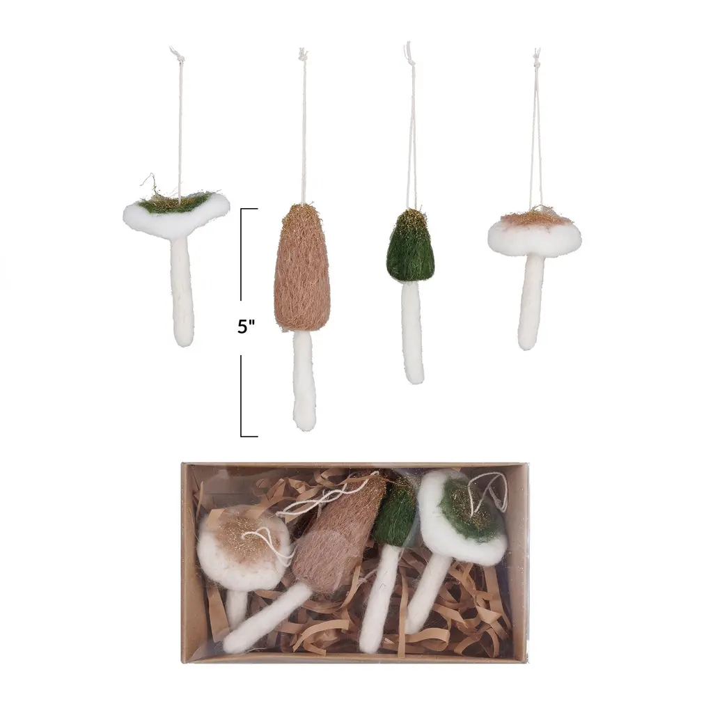 A whimsical set of wool mushroom ornaments, each dusted with gold glitter, bringing a touch of enchanted forest magic to the decorFeatures: