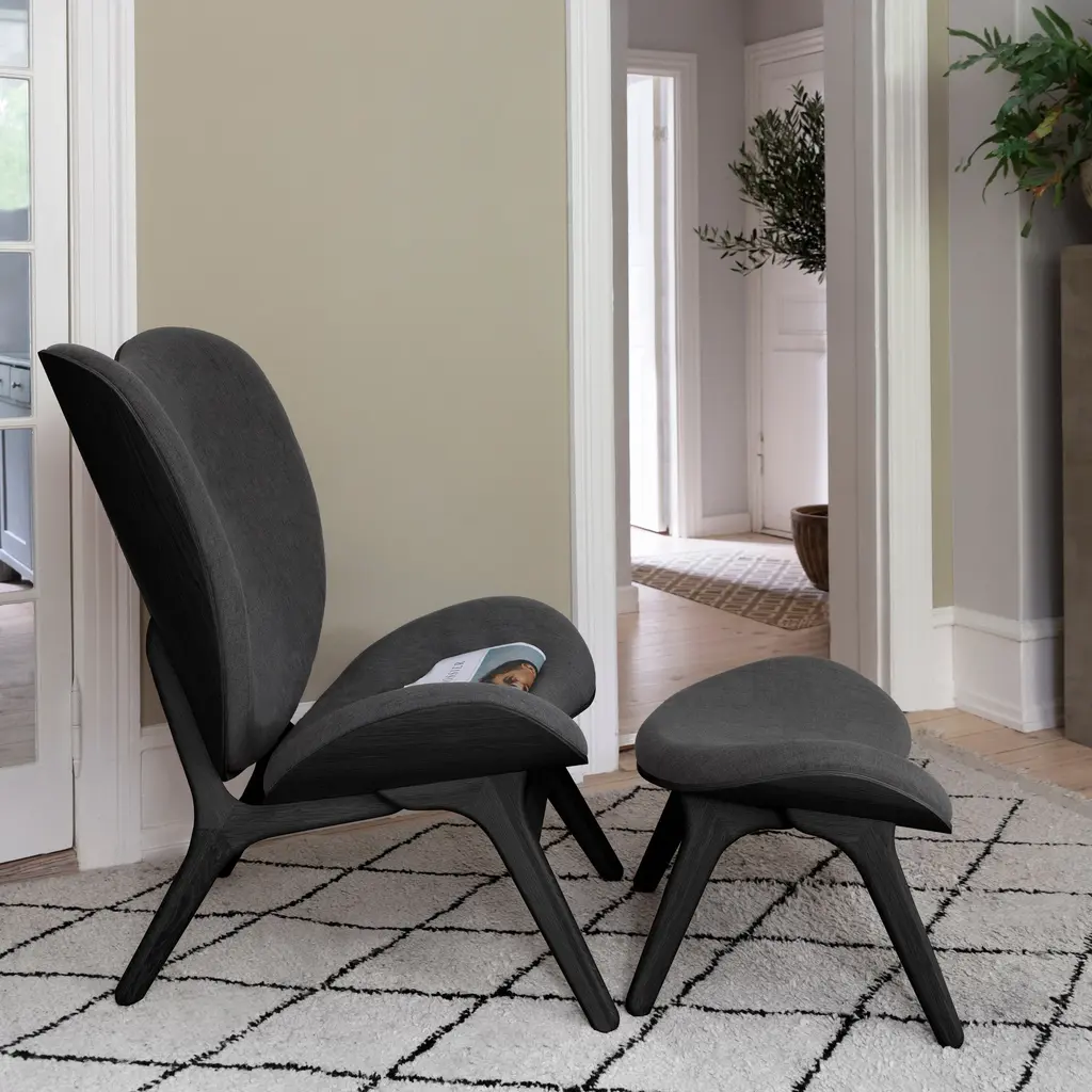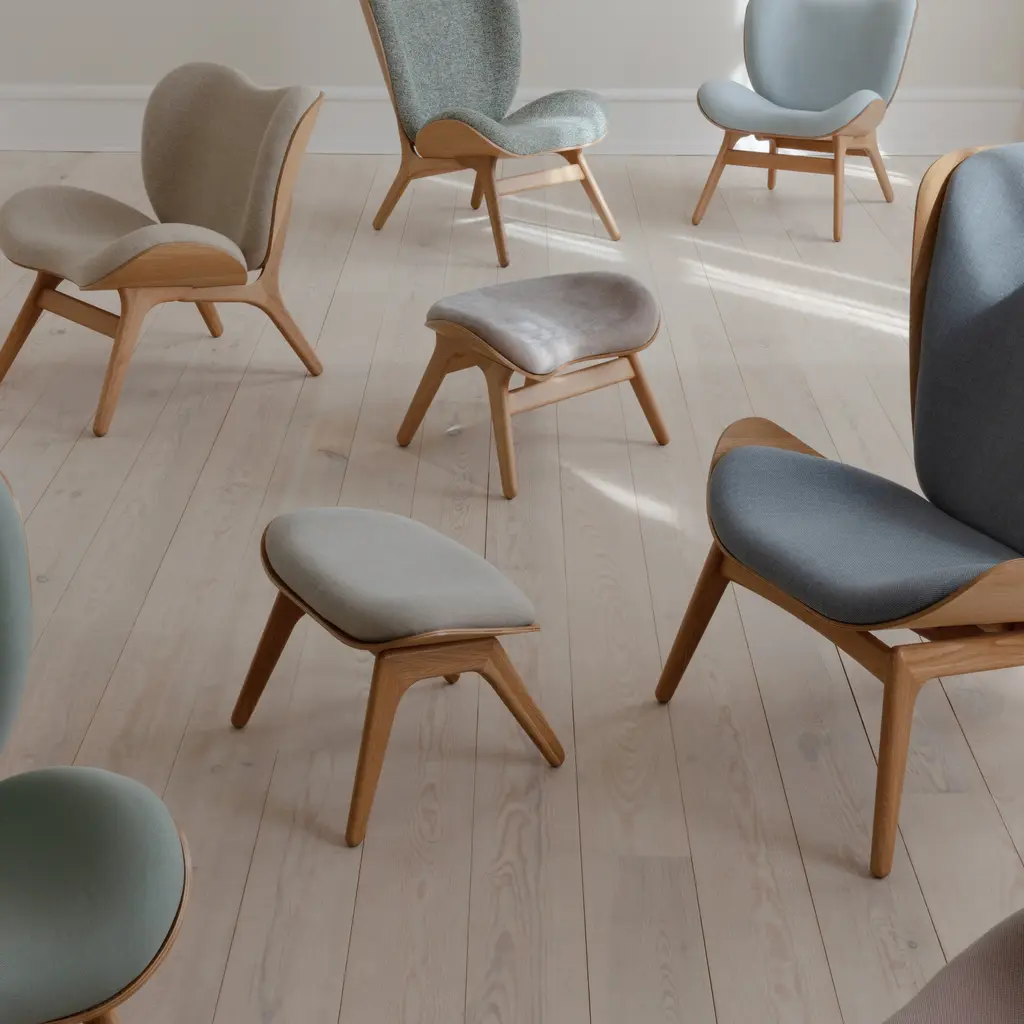 Anders Klem's organically contoured ottoman extends the expressly comfortable premise of his similarly curved companion armchair. A Conversation Piece's elements readily adapt to the footrest shape with the same wood shell construction and the collection's unusually extensive range of colorful upholstery options. Emphasizing the surface grain, the oak base comes in a choice of natural, dark and blackened finishes.