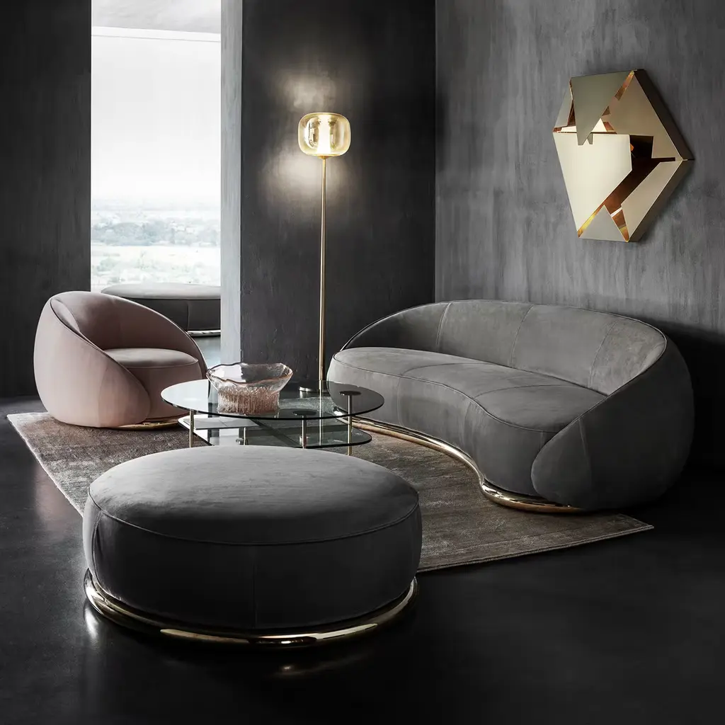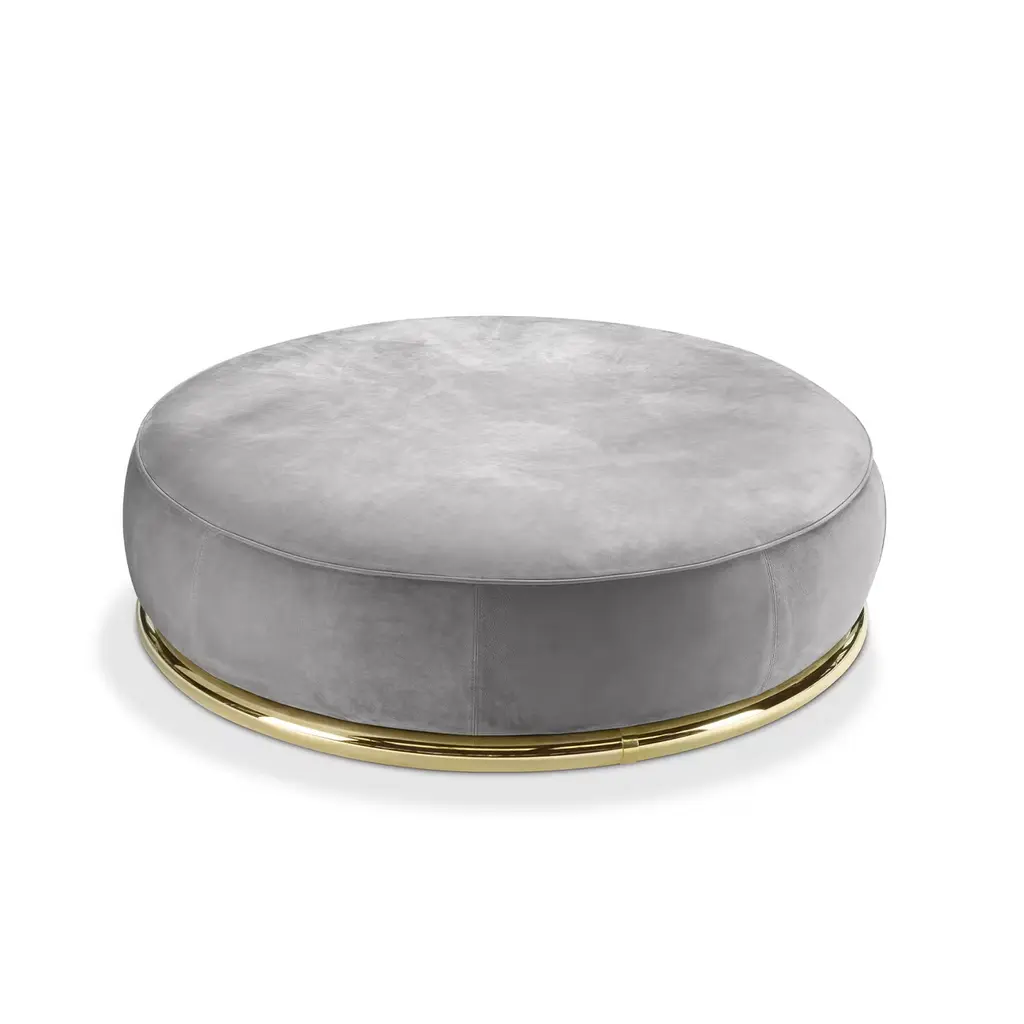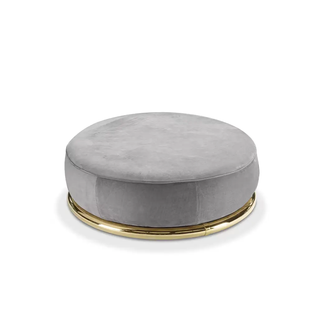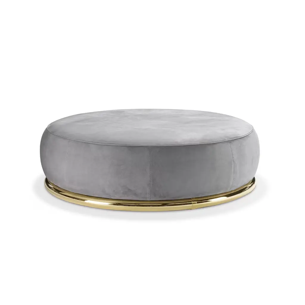 A modern interpretation of the iconic and sleek shapes of a classic ottoman, this magnificent piece flaunts a round silhouette entirely upholstered with fine gray-colored leather. The perfect match to the gray sofa from the Abbracci series, it will create a welcoming and comfortable corner of relaxation in any modern or traditional home. The piece rests on a sturdy base in polished gold-finished brass. For the US market, please contact the Concierge for CAL TB 117 certified fabrics.