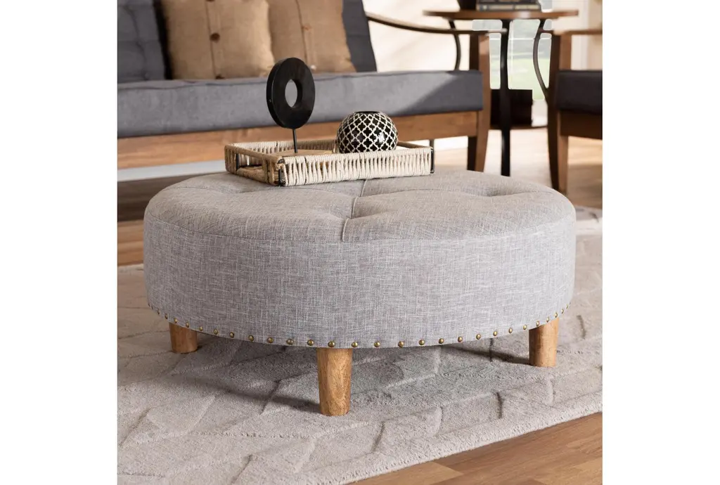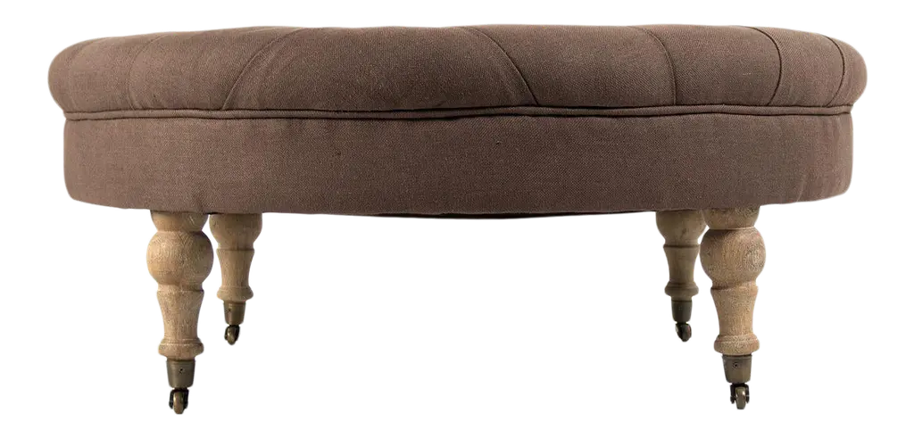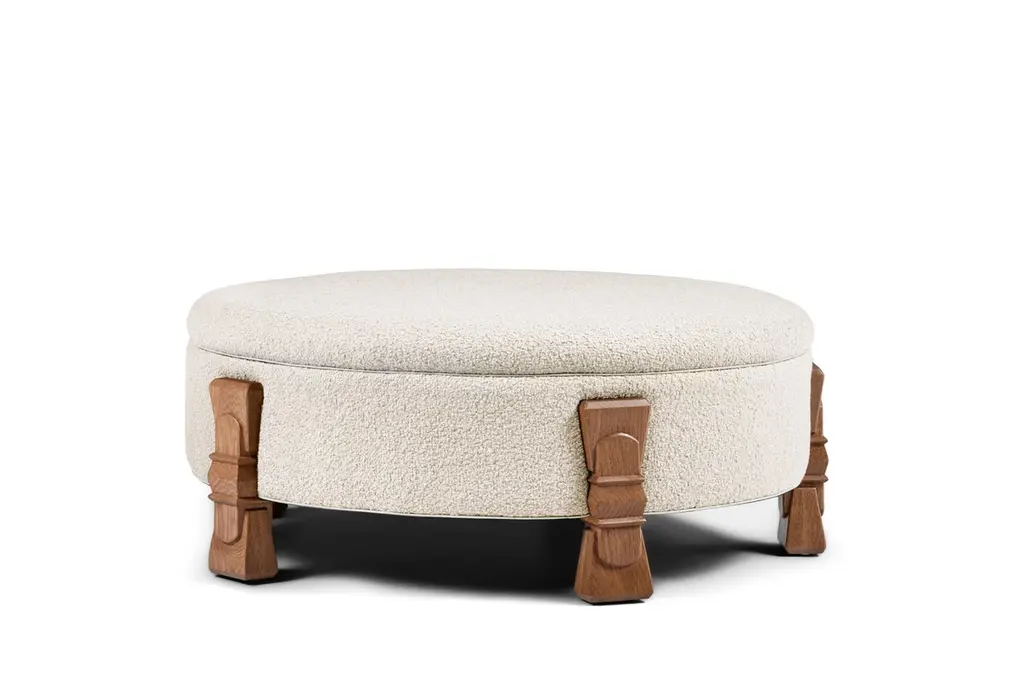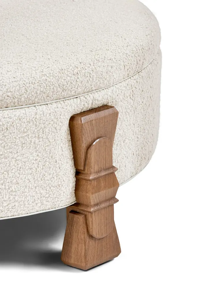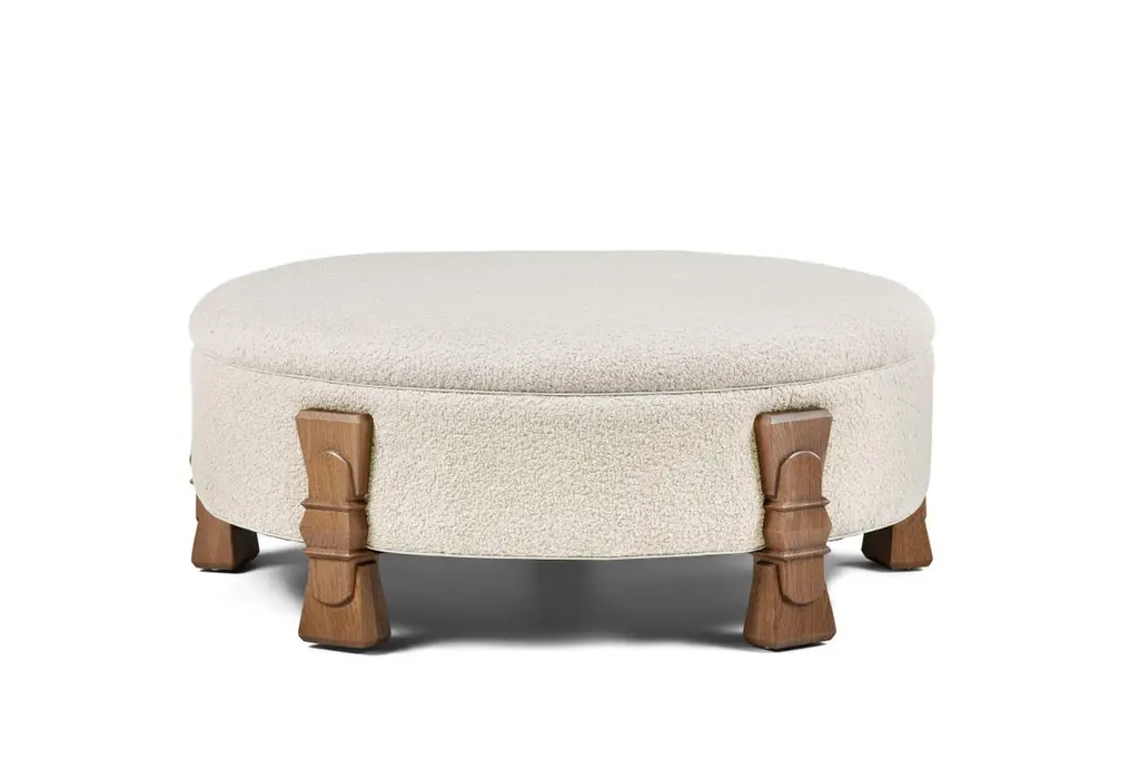 Our artisanmade Alden Ottoman is the newest addition to our line. A textural mix of ivory bouclé and white oak combine with leather piping in this unique piece. The hand-carved legs are made by local artisans. Equally, at home in a Lake Tahoe chalet, Sea Ranch beachfront dwelling or Laurel Canyon abode, we designed this piece with California’s majestic views in mind. Bench made, in Los Angeles, this piece celebrates the natural beauty of the materials.Shown here in our Summer Aged Oak finish, legs are also available in Natural White Oak, Sunkissed Oak, Canyon Oak, Riviera Oak, Dark Walnut and Heirloom Walnut. Dimensions: 43"DIA x 15.5"HAlso available in 36"DIA, 30"DIA and 17.5"DIA. Inquire for pricing and yardage.COM Yardage:Fabric: 5 yards solid (inquire for patterns)Trim: 8 yards, with flangeAll of our pieces are bench made in Los Angeles by local artisans. Current lead time: 16 - 22 Weeks + transit time. Inquire about customizations, alternate materials & finishes.About August Abode:August Abode is a moving portrait of California life, an invitation to reconnect with the allure of nature to enhance our everyday lives. Founded in Los Angeles in 2019 by designer Stefani Stein, August Abode is an artisanmade home collection capturing the West Coast spirit of endless summer. We make relaxed and refined statement essentials inspired by the beauty of living in the Golden State.Through observation and abstraction of nature, we design furniture and wallcoverings in which form, function, and fine craftsmanship have the ability to positively impact our everyday lives through our homes.We are committed to making responsibly, not overproducing. Our view is to make future heirlooms. Discouraged by the impact of Los Angeles landfills being the largest in the county, we aim to reduce our participation in the epidemic of thoughtless production. Our made-to-order pieces encourage a steady flow of business to LA’s rich artisan trade community, while keeping our production process local and environmentally ethical. We are investing in the next generation of skilled makers, to encourage a sustainable and vertical model that reduces wasteful production.