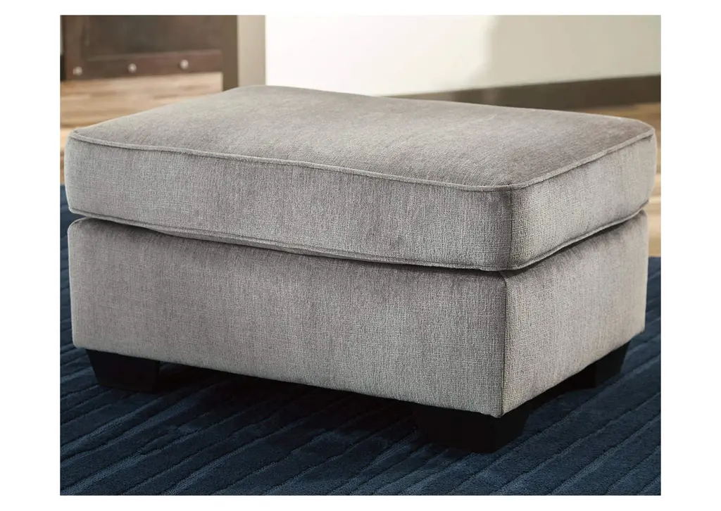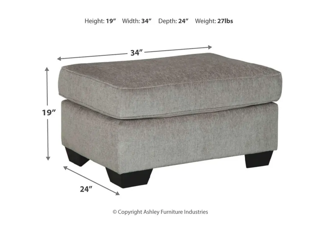 If style is the question, then the Altari ottoman is the answer. Its decidedly contemporary profile is enhanced with plump cushioning and a chenille-feel upholstery that's so pleasing to the touch. Rest assured, this ottoman in richly neutral alloy is sure to play well with so many color schemes. Weight 27.000 lbs. (12.15kgs.)