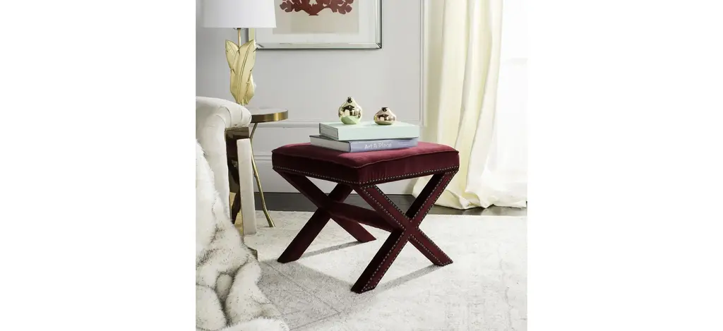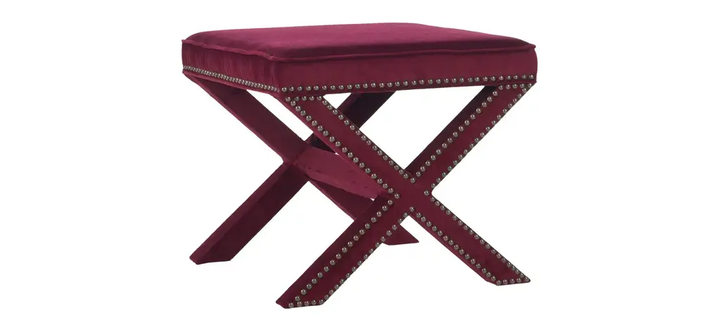The Amais Ottoman offers a designer look that gives your decor a glamorous finishing touch. Its classic form, plush red velvet cotton, and brass nail head trim make Amais versatile enough for any interior.