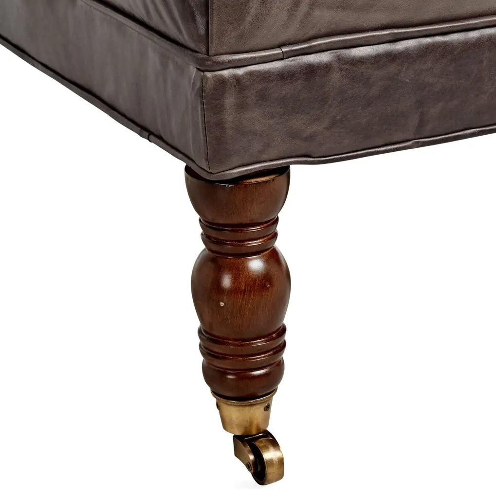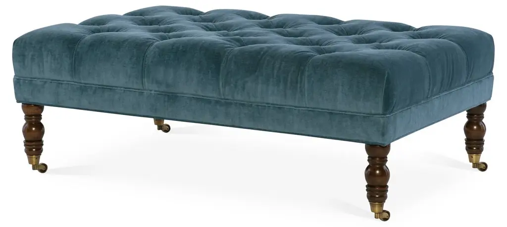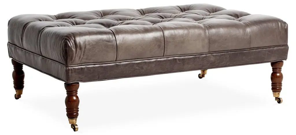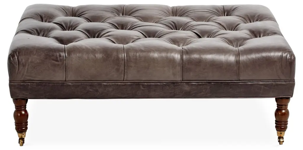 Exclusive to One Kings Lane: This tufted classic ottoman features a traditional turned leg with brass caster. It is upholstered in Crypton leather which offers performance characteristics that repels stains and spills. Each piece is handcrafted by skilled artisans in High Point, NC and offers a lifetime warranty on the frame and suspension system.