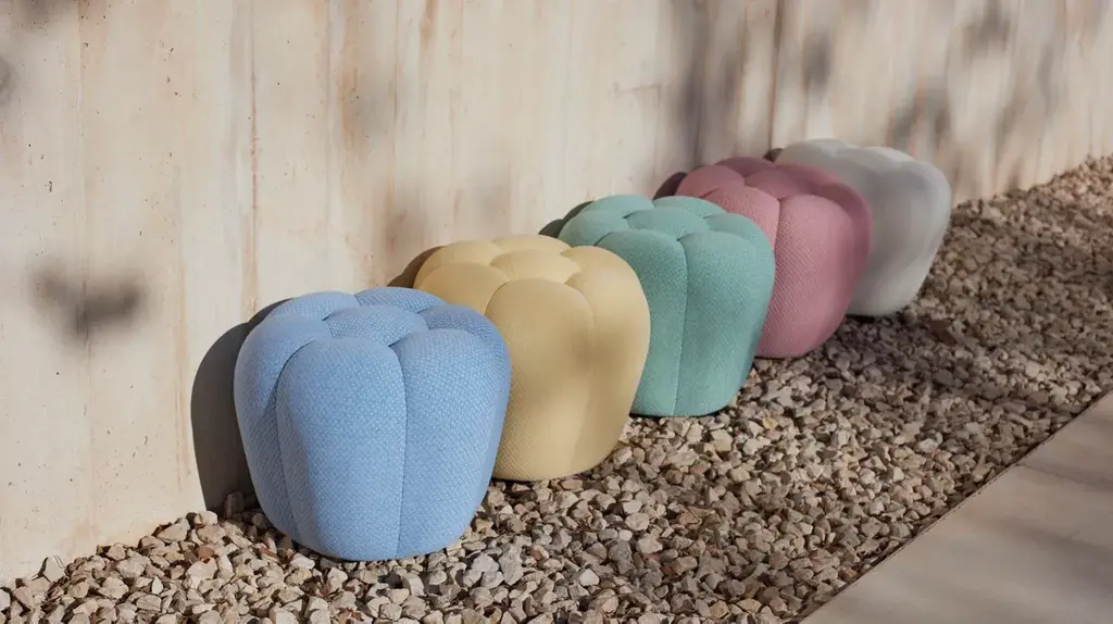 Upholstered in outdoor fabric. Seat in DRYFEEL polyurethane foam, bi-density S/MS and polyester fibers. Structure in okoume plywood. Base in black ABS. Made in Europe