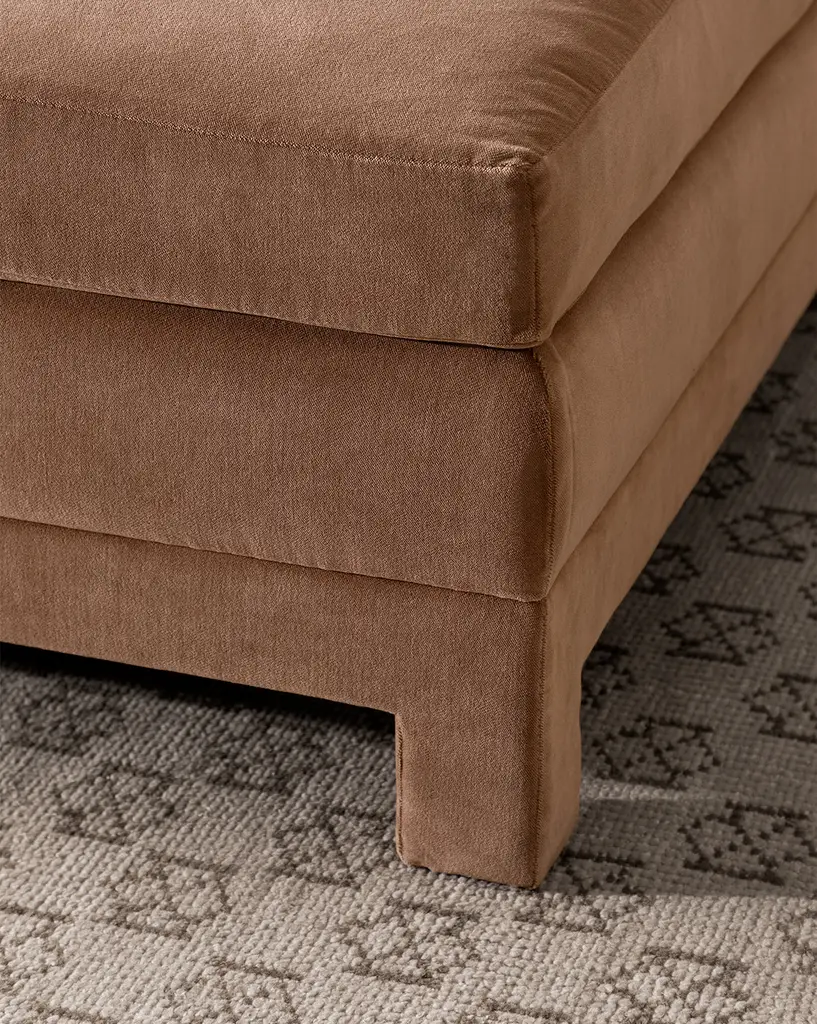 Made to order with a timeless silhouette and upholstered legs, the modern frame of the Appoline Ottoman holds a wide cushion that is firm, yet comfortable. As part of the made to order Upholstery Collection, the ottoman is available in a selection of high-quality fabrics that highlight its simple and elegant frame.