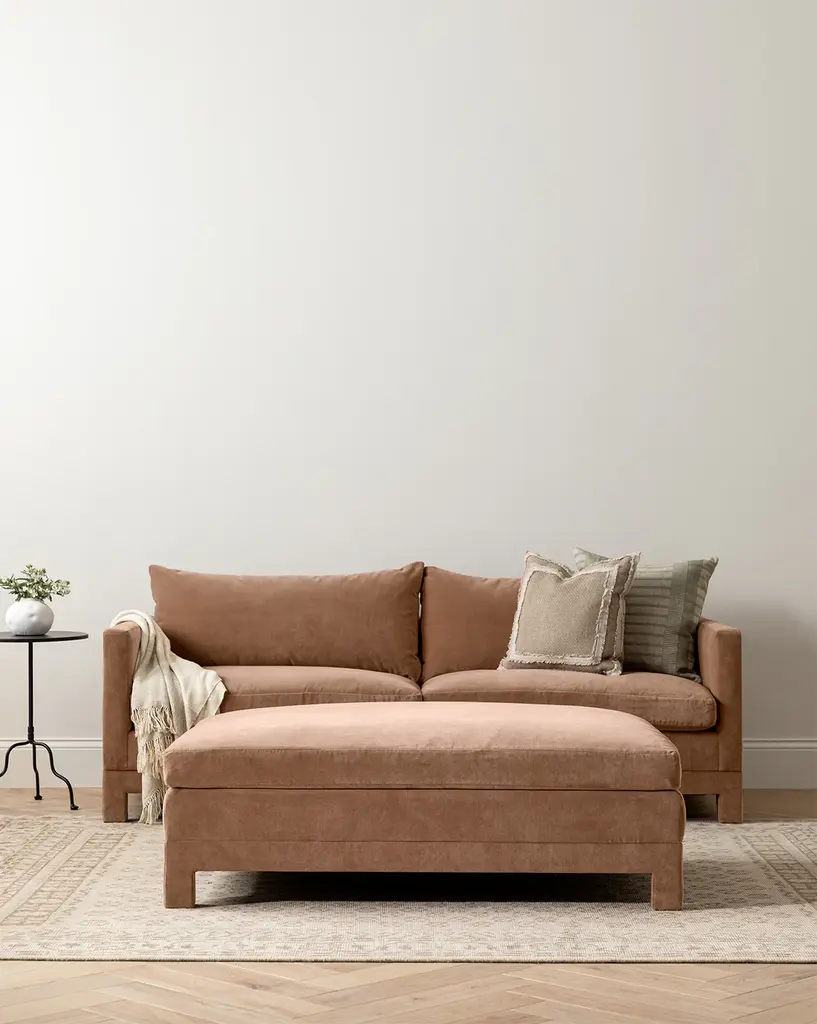 Made to order with a timeless silhouette and upholstered legs, the modern frame of the Appoline Ottoman holds a wide cushion that is firm, yet comfortable. As part of the made to order Upholstery Collection, the ottoman is available in a selection of high-quality fabrics that highlight its simple and elegant frame.