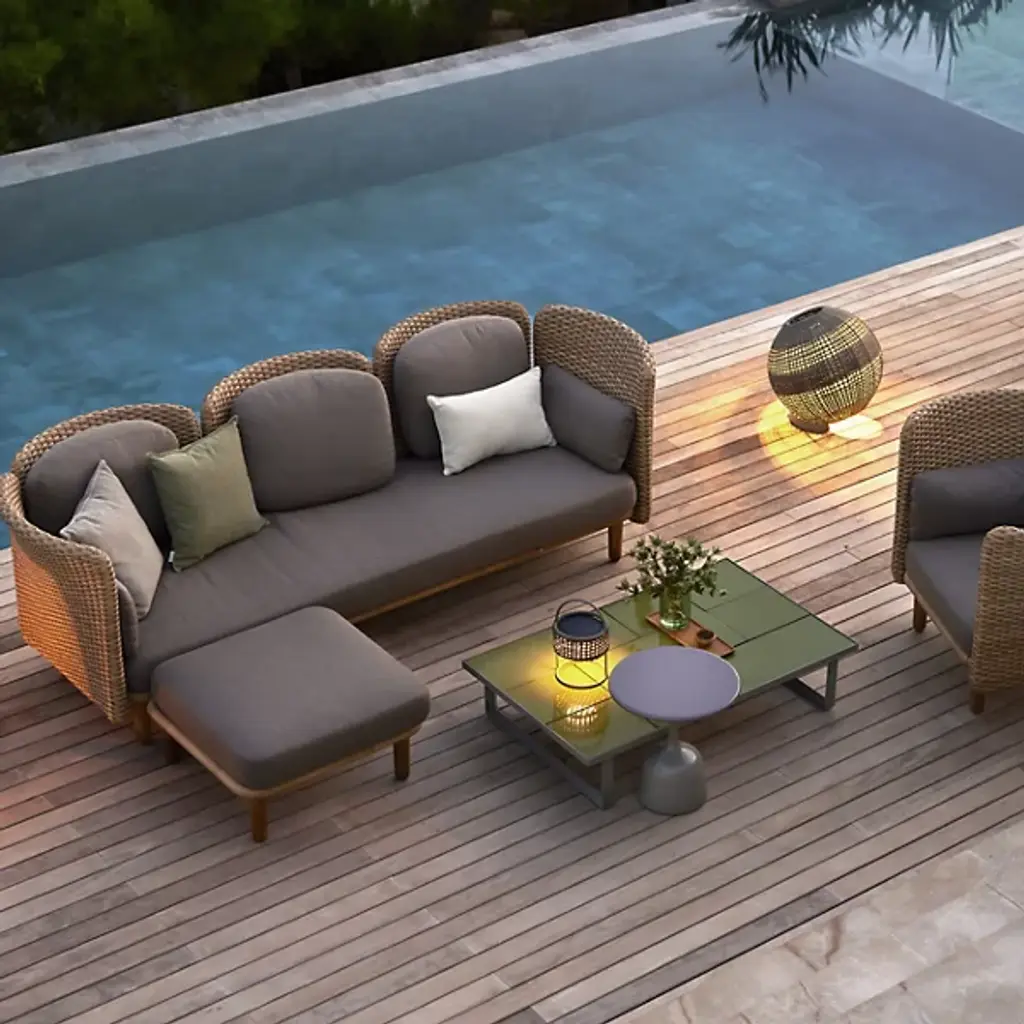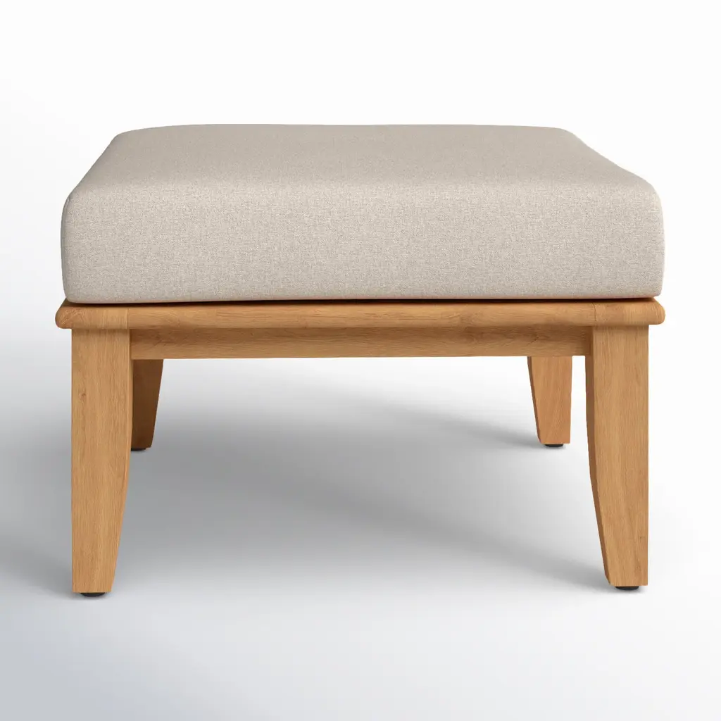 Inspired by architectural curves, the Arch Outdoor Ottoman from Cane-line brings low-profile relaxation as a handcrafted, flexible design. The piece evokes simpler times, as shown in its rich wood legs and handwoven accenting. The Cane-line weave adds an intriguing texture that contrasts with the smooth and ample cushion. Fine upholstery outlines the cushions. The Air-touch fabric's Quickdry technology proves essential on rainy days. Use the ottoman as an impromptu seat or an added foot-resting element.