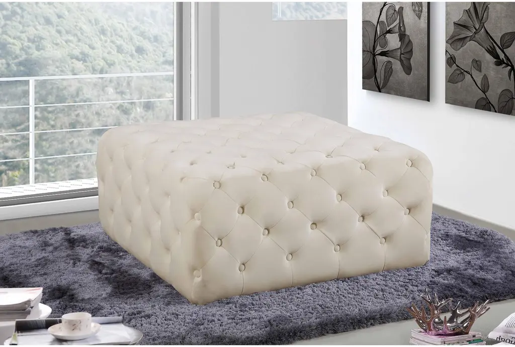 The Ariel Cream Velvet Rectangle Upholstered Ottoman / Bench is a versatile piece perfect for any living room or bedroom. Its soft cream velvet fabric offers a plush feel, while the sturdy construction ensures durability. The tufted detailing adds a touch of sophistication to this modern ottoman.
