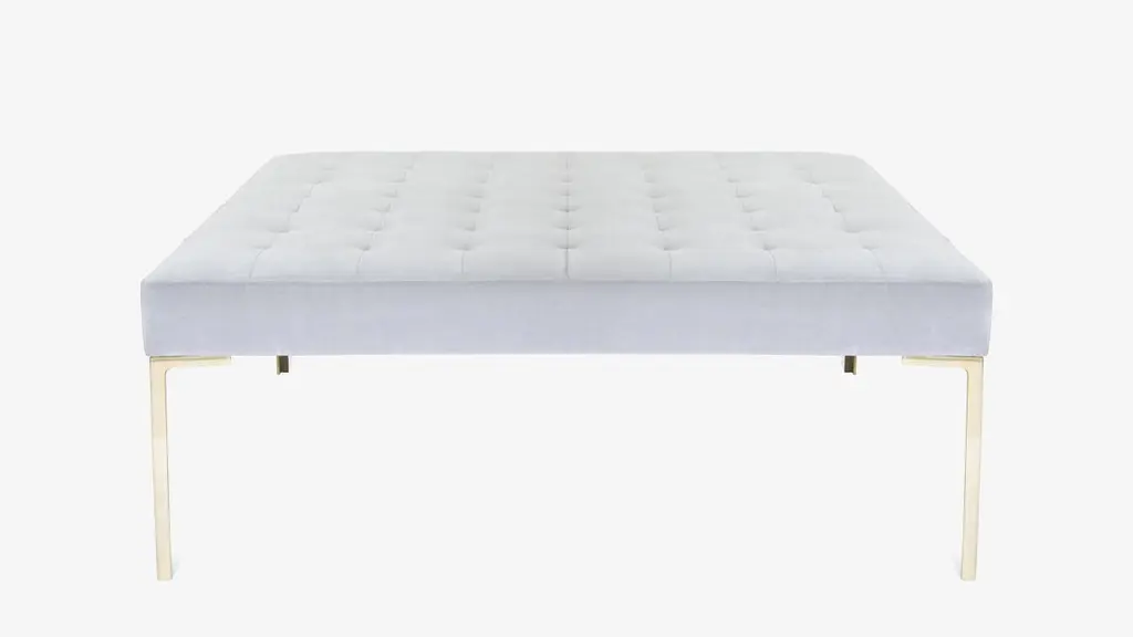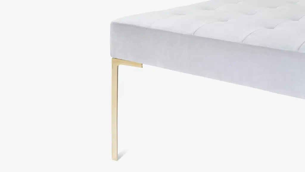 Designed by Montage, the Astor large ottoman is a wonderful addition to a refined interior space. Astor was designed with the delicate proportions of the midcentury, celebrating an era of design that remains ever so popular today. The Astor collection is designed and manufactured in-house by Montage in Connecticut. Shown in a supple velvet in the color Sharkskin, incredibly durable, with countless colors to choose from. The brass legs are cast and polished in the USA, a contemporary interpretation of vintage Italian design. Available with a plain or tufted (shown) top with fully customizable overall dimensions. The options are limitless.These are made to order to ensure the best quality. Montage has a large fabric library and would be happy to mail swatches of other colors and fabric qualities. The cast brass legs are also available in a nickel plated variation. We are able to fulfill orders of quantity and custom sizes.