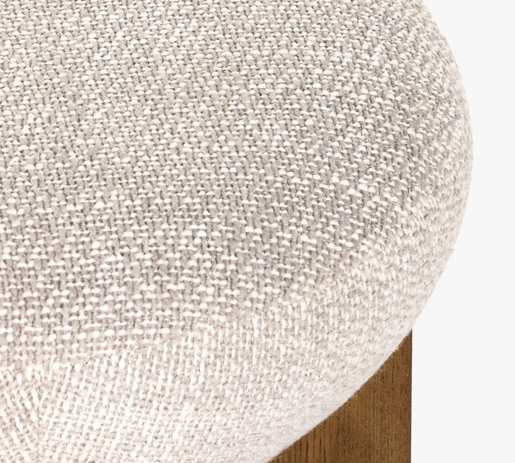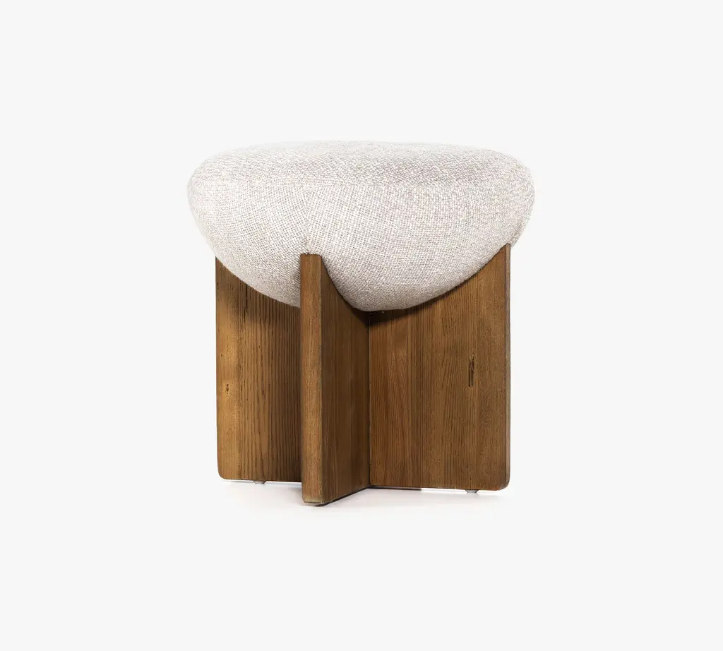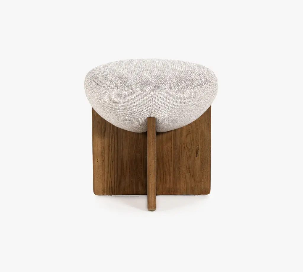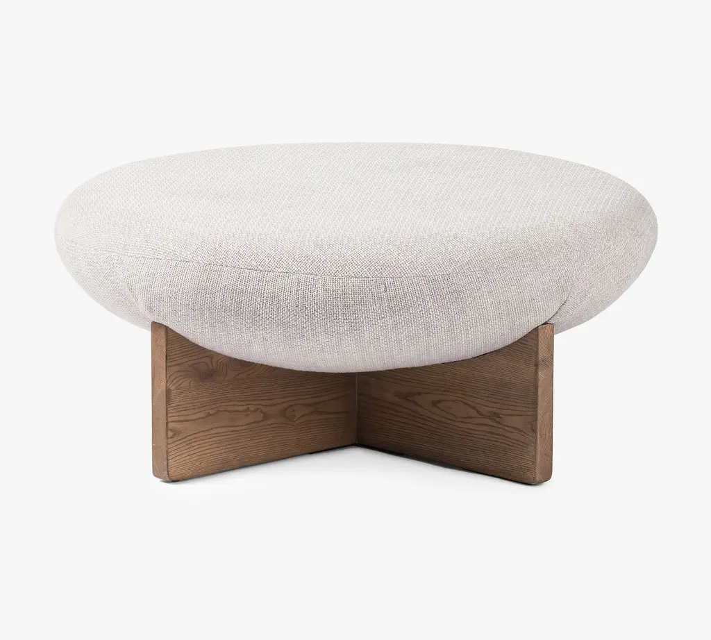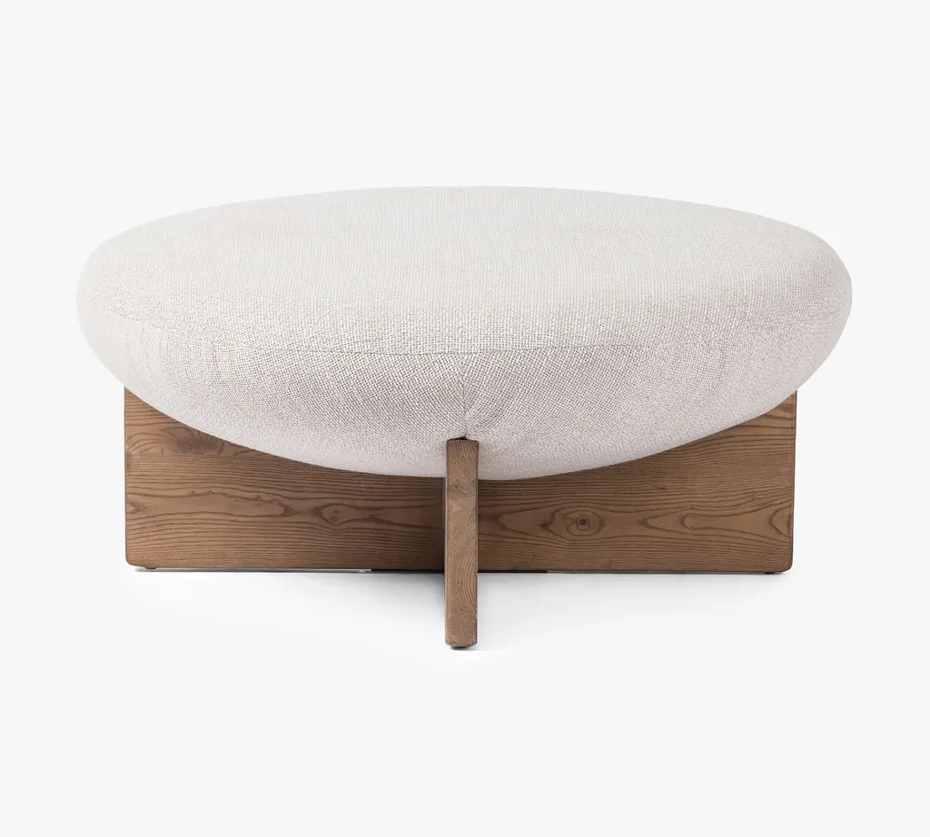 This hemispherical ottoman rests in the bowl formed by its crossed, solid ash pedestal. The hand-finished, grainy, wood block base contrasts richly with Atherton’s soft, upholstered cushion. Depending on the size of your space, opt for the larger or smaller version as extra seating or an impromptu tabletop, wherever needed.