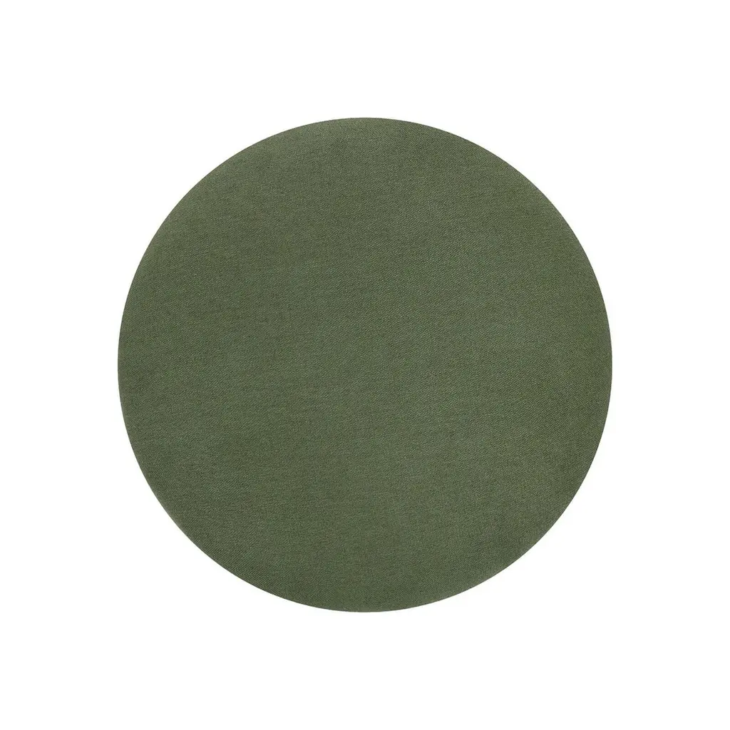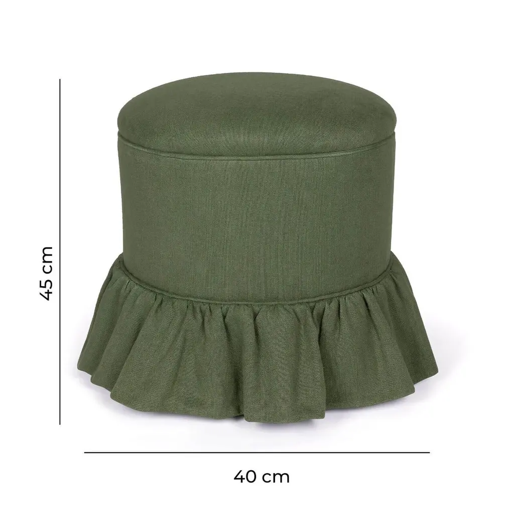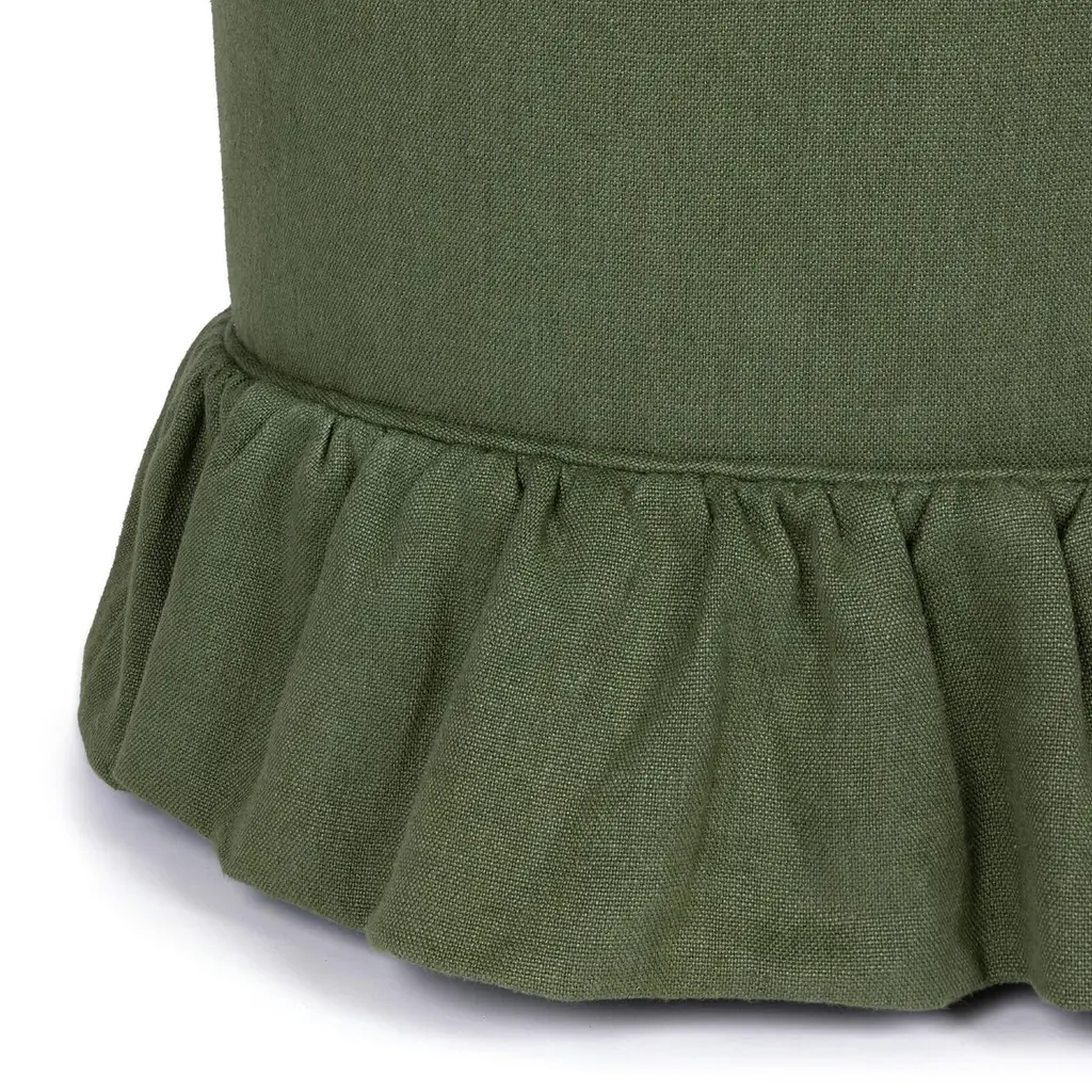 Reminiscent of early modernist furniture and embracing the curved edges and rounded silhouettes found in Nature, this bottoman (an ottoman to sit your bottom on), is swathed in forest green, 100% hemp for a natural aesthetic and finished with a soft, ruffled skirt and round wooden feet.