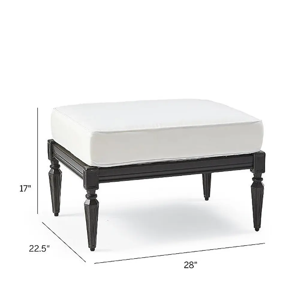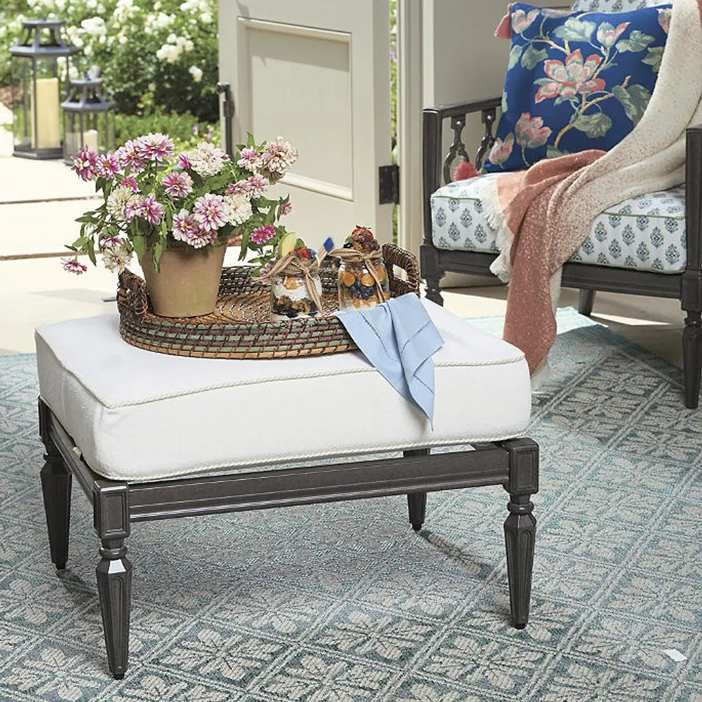 The quatrefoil motif encircling this ottoman puts a contemporary twist on the age-old iron gates of Europe. It is expertly crafted of cast aluminum with hand-filed welds, powdercoated finish and weather-defying solution-dyed acrylic cushions. Avery is built to stand the test of time and mix well with our other collections. Part of the Avery Collection Aluminum frame is cast from a mold handcrafted by artisans Durable frame is finished with a protective powdercoat to further protect against the elements Finished with hand-filed welds Frame is backed by an industry-leading 10-year structural warranty Includes seat cushion All-weather cushions have a high-resiliency foam core wrapped in plush polyester 100% solution-dyed fabric resists mold, mildew and fading – and is easy to clean Cushions also available with 100% waterproof Sunbrella® Rain performance fabric Piping color on cushion matches the stripe color Slate finish Also available in white finish Imported At Frontgate, our primary focus is quality. We guarantee that every product we sell will stand up to the supreme test – our customers' satisfaction. To learn more about our policies, visit our Shipping & Processing, Returns & Exchanges and Warranty & Price Guarantee pages. Please Note: Digital renderings are available in select fabric options. If a digital rendering is not available, we recommend ordering a swatch before completing your order. Digital renderings of custom upholstery may differ in pattern placement from the actual item. Because colors can vary from screen to screen, we recommend ordering a swatch before completing your order. We offer free swatches of all our fabrics. 10-swatch maximum. Solid and stripe swatches measure 4"x4" and pattern swatches measure 8"x8". View and order swatches here.