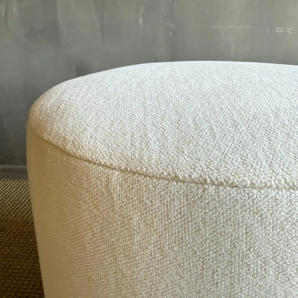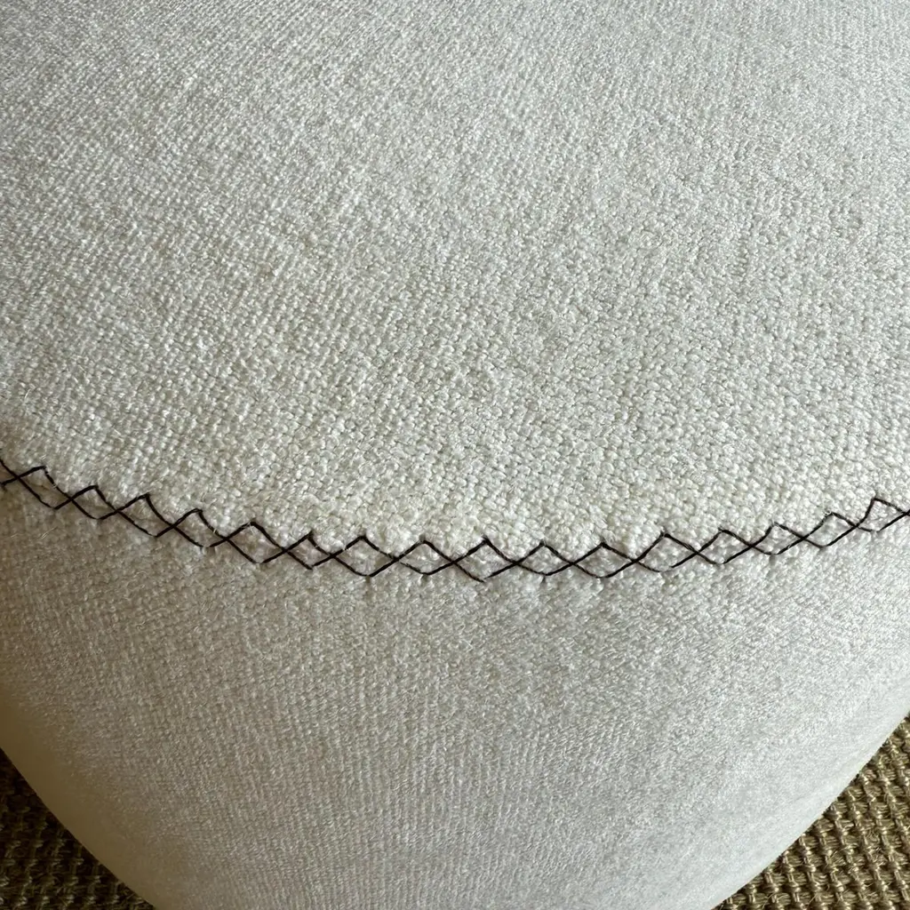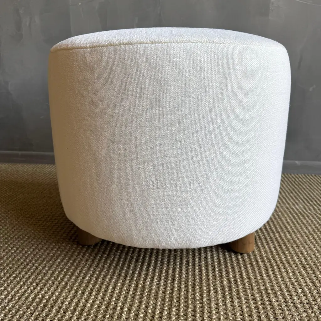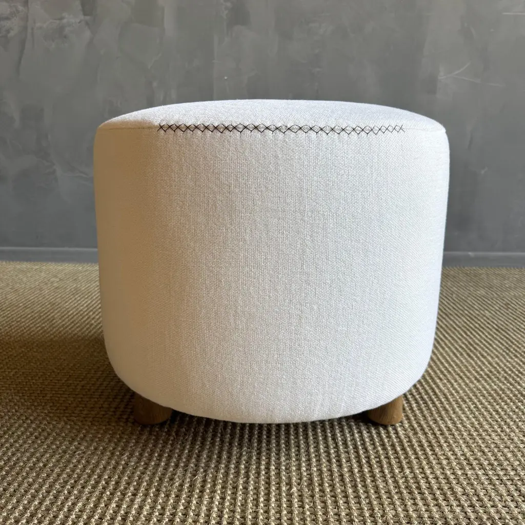 Introducing the Bailey Round Ottoman, by bloom home inc.Covered in a sophisticated heavy weight hemp fabric, this ottoman is versatile and stylish. The sturdy solid wood frame guarantees durability, while the medium-firm density foam offers both comfort and support. Whether you need additional seating or a footrest, this ottoman is perfect for any living room, bedroom, or entryway. Add a touch of functionality and chic style to your space with the Bailey Hemp Round Ottoman.Fabric: 100% hemp Oyster/ Heavy Stone Washed FinishColor: Soft WhiteLegs: White Oak / Montana BrownDetail: Hand Stitched X Pattern along seam.Size: 20″ D x 17.5″ H