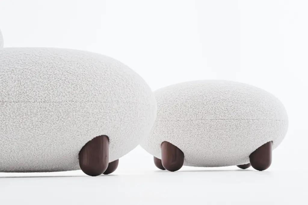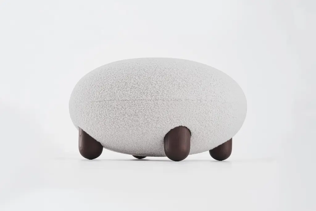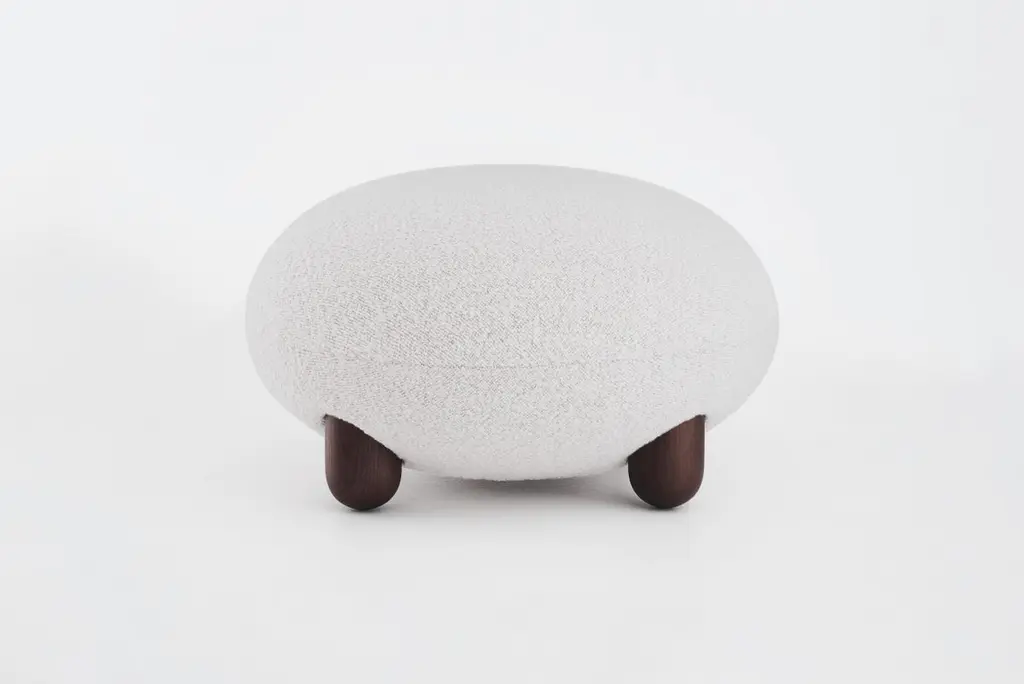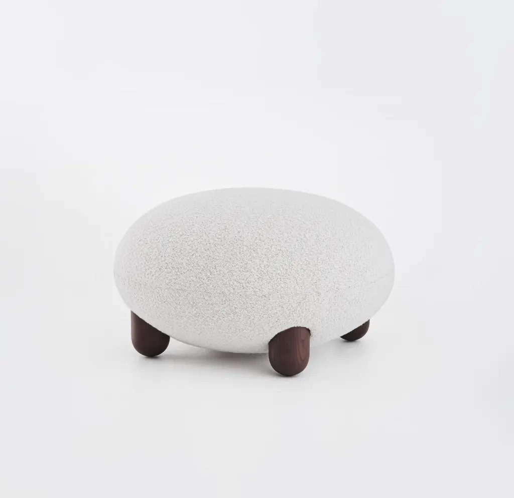 Baloo Boucle Flock Ottoman by NOOMDimensions: D 70 x H 41 cm Materials: Wood, plywood, metal, moulded foam, textile..Weight: 15 kgAlso available in other materials and colors.The “Flock” furniture collection draws on the idea that home is a place of comfort, sanctuary, and gathering and should be filled with personalized, character-rich, and eye-catching statement objects. Soft, voluptuous, sensual forms, natural materials, and pleasant-to-the-touch surfaces reflect a desire for warmth and cocooning. "Subtly curved artistic silhouettes, soft fabric, and wooden legs define the furniture's relaxation and cuteness. We wanted to create furniture that would become part of the family, intimate and beloved," - said Kateryna Sokolova, designer of the Flock collection. The name "Flock," which means "to move or come together," refers to the collection's role as a peaceful oasis and the main meeting space within the home.About, NOOM is a leading design brand from Ukraine. Working at the intersection of art and craftsmanship, driven by a curiosity for testing new materials, finishes, and techniques, NOOM produces eye-catching furniture, lighting, mirrors and décor for private and commercial interiors, including cutting-edge collectable design pieces. Balancing between expression and function, NOOM is a place where design meets art. The company was founded in 2017 by industrial designer Kateryna Sokolova, with designer, and entrepreneur Arkadii Vartanov. Arkadii and Kateryna teamed up to bring together the very best of design, materials, and craftsmanship. Combining traditional and modern manufacturing technologies, NOOM aims to design functional and striking products that are "built to last". "Our objects lie between design, art, and craftsmanship," said the designers. "Managing the manufacturing of our creations, we oversee the entire production process and pay exceptional attention to every detail in each piece”.