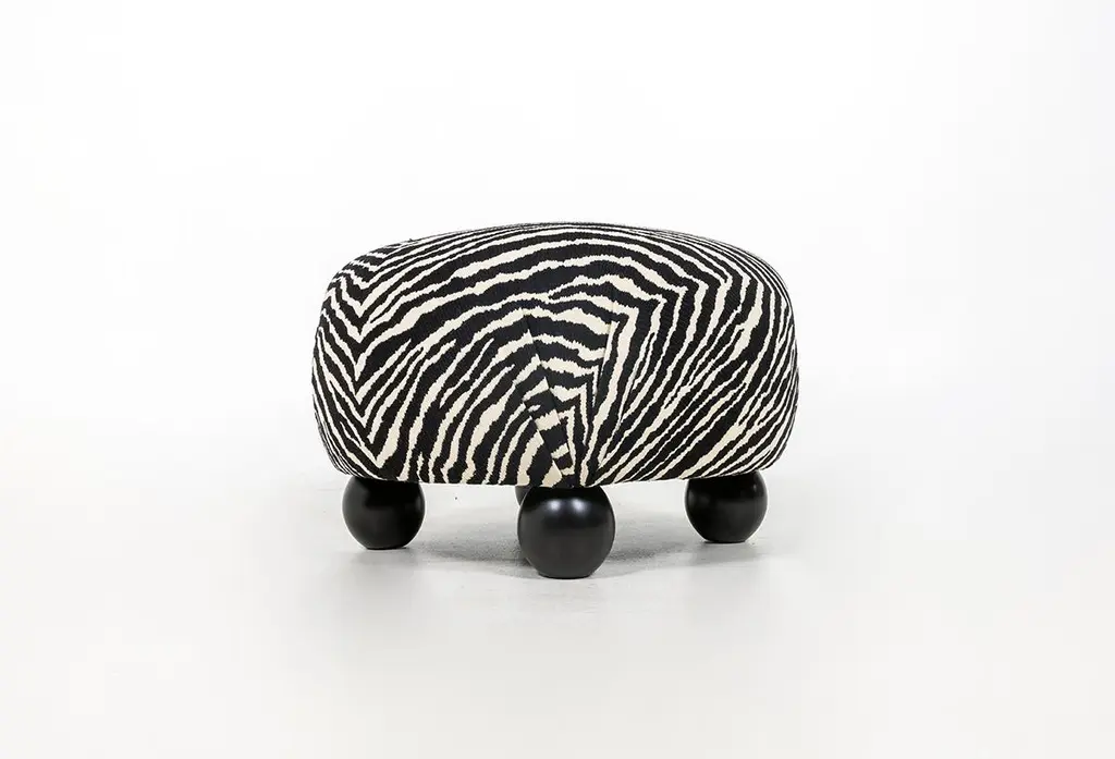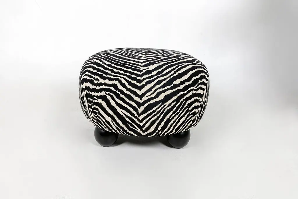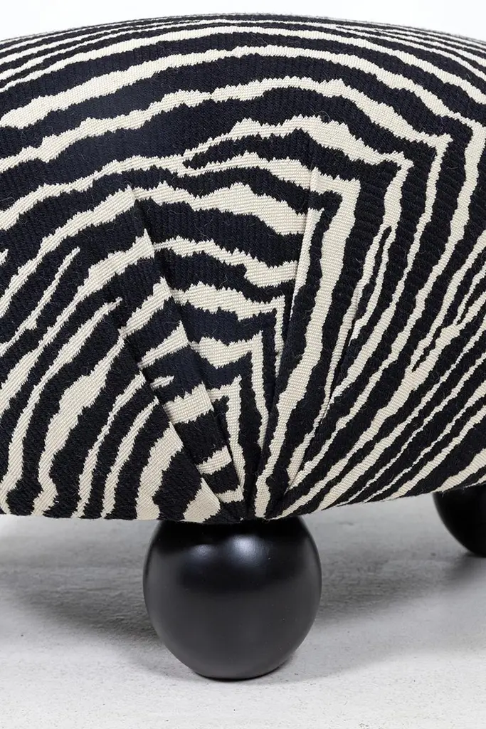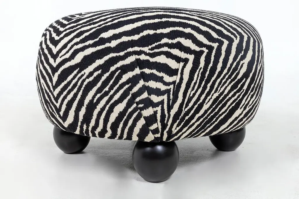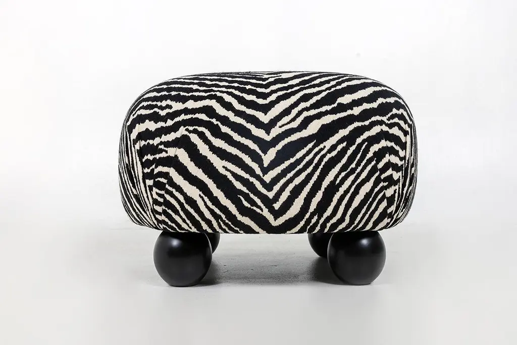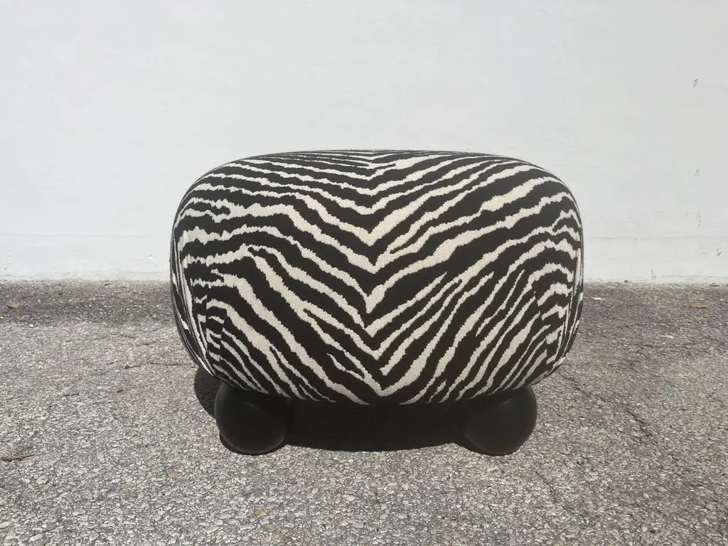 Beautiful Modern Ottoman in the style of Josef Frank, ottoman has four solid wood bun feet, upholstered in best zebra fabric money can buy. Fabric is about 60% virgin wool.Ready for a new home, excellent condition.One ottoman ready to ship. More available.